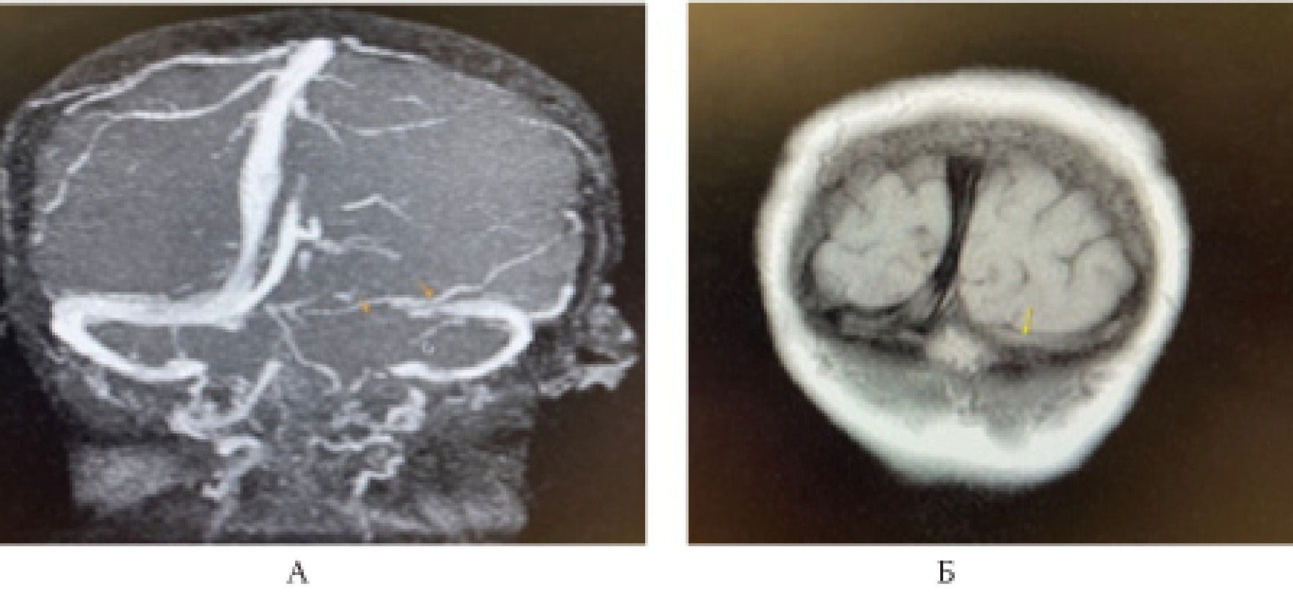 Рис. 3. Магнитно-резонансная венографическая картина: отсутствие сигнала от кровотока по значительной части левого поперечного синуса (А), что не позволяет исключить тромбирование, либо замедление кровотока (Б), с учётом Cor N1 взвешенного изображения