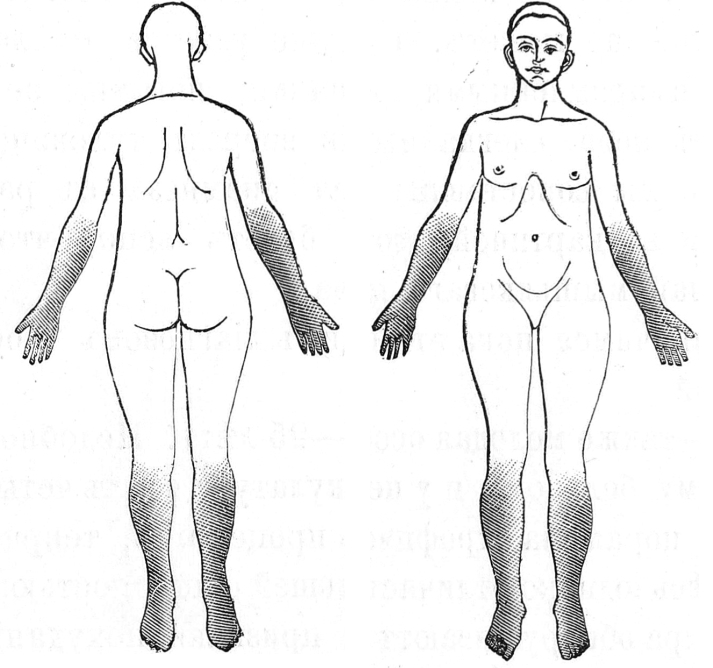 Вы видите, такимъ образомъ, что клиническая картина у нашей больной до сихъ поръ совершенно аналогична съ той, какую мы встрѣтили въ первомъ случаѣ; она отличается развѣ большей рѣзкостью всѣхъ составляющихъ ее симптомовъ. Нѣсколько иной результатъ мы получаемъ при изслѣдованіи кожной чувствительности на конечностяхъ. Тактильное чувство и чувство тепла представляются ослабленными, причемъ это ослабленіе наиболѣе выражено на периферіи рукъ и ногъ, а по направленію къ туловищу постепенно ослабѣваетъ (фиг. II).