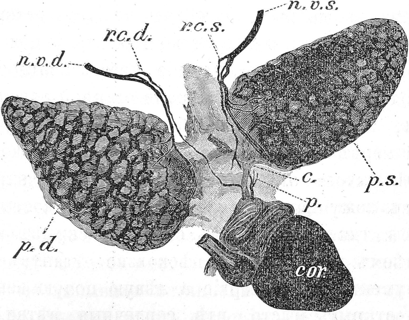 На прилагаемомъ рисункѣ, сдѣланномъ изъ-подъ лупы видно, что r. cardiacus sin. перерѣзанъ, такъ что его стволикъ имѣетъ одинъ центральный конецъ (с) и другой-периферическій (р).