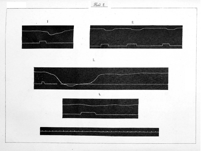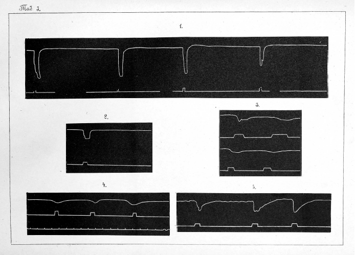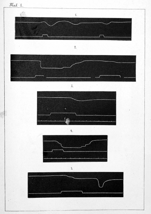 Приступая къ постановкѣ опытовъ надъ животными при помощи этого прибора, мы прежде всего вычислили скорость вращенія закопченнаго цилиндра. Скорость эта равнялась 3 сек. Для полученія самой кривой сокращенія мы поступали нѣсколько иначе, чѣмъ это рекомендуетъ Rosenthal 1): мы обклеивали вращающійся цилиндръ бумагой, закапчивали ее и затѣмъ насаживали цилиндръ на стержень. Вслѣдствіе этого по снятіи закопченной бумажки съ цилиндра кривая у насъ получалась въ обратномъ видѣ, т. е. противоположная той, которую приводятъ въ руководствахъ по физіологіи.