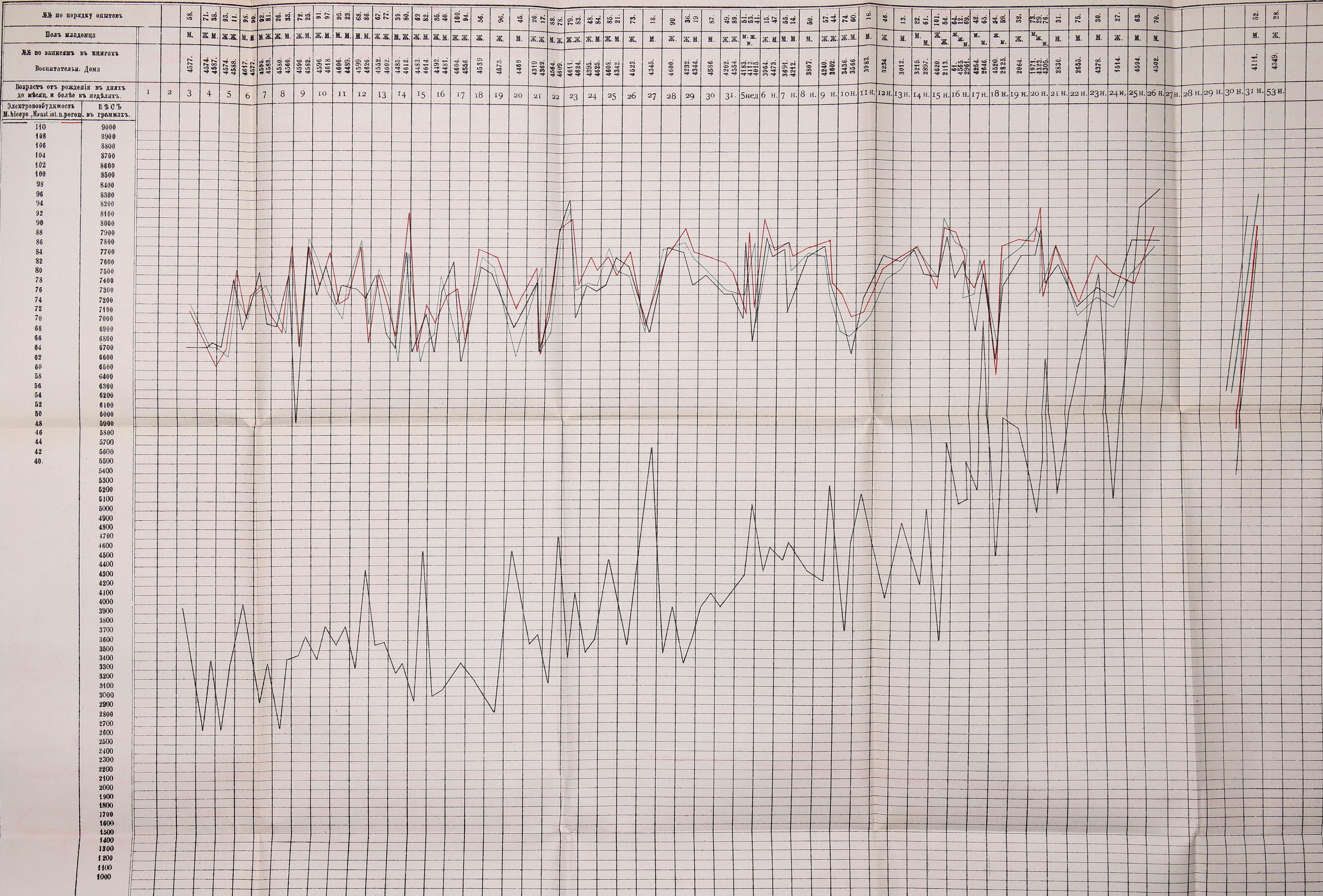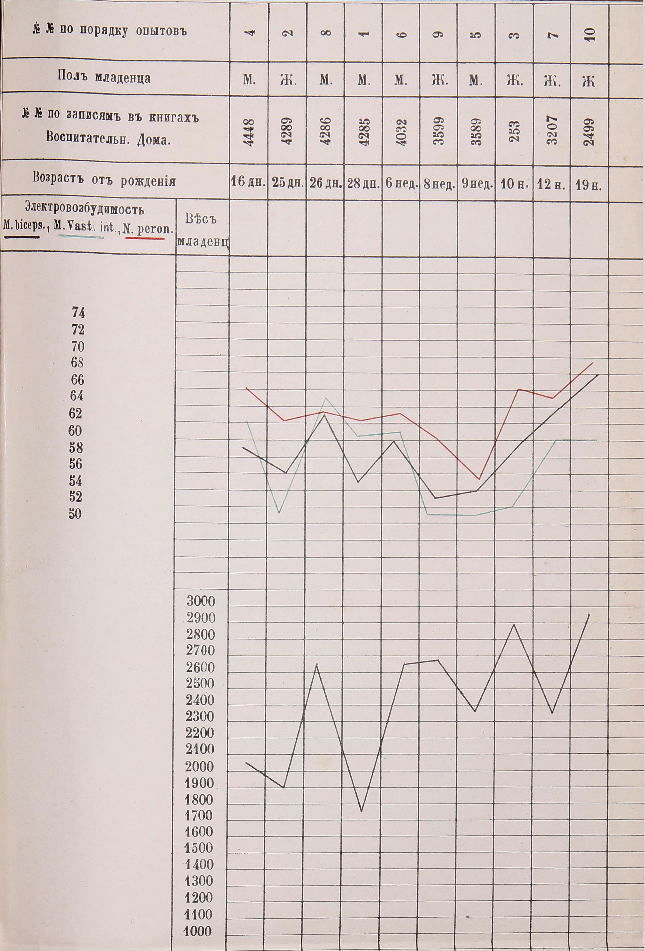 Все, сообщенное нами въ протоколахъ, мы постарались изобразить на прилагаемыхъ таблицахъ въ видѣ отдѣльныхъ кривыхъ. Весь матеріалъ мы распредѣлили на двѣ группы: наибольшая, трактующая о дѣтяхъ доношенныхъ, и меньшая— о недоноскахъ. Дѣти распредѣлены по возрасту, начиная съ 3-го дня жизни. За время нашихъ занятій въ Воспитательномъ Домѣ дѣтей первыхъ двухъ дней жизни, къ сожалѣнію, не было. Хотя, строго говоря, характеръ кривой отъ этого, пожалуй, ничего не выигралъ. Слѣдя за движеніемъ кривой вѣса тѣла младенца, мы конечно, нисколько не удивляемся, что онъ постепенно ростетъ, увеличивается. О болѣе тонкихъ колебаніяхъ его мы скажемъ ниже. Но затѣмъ, переходя къ наблюденію за движеніемъ трехъ кривыхъ раздраженія m. bicipitis, nervi peronei и m. vasti interni, насъ поражаетъ почти полный паралеллизмъ между ними. Эти три кривыя можно раздѣлить на всемъ ихъ протяженіи на три части: первая часть занимаетъ направленіе кривой съ 3-го по 23-й день; вторая часть—съ 24-го дня по 10-ю недѣлю и третья часть—съ 10-ой недѣли до года и далѣе. Первую часть можно охарактеризовать тѣмъ, что въ ней электровозбудимость имѣетъ, повидимому, наклонность возрастать; начиная съ 4-ой недѣли до 10 недѣли электровозбудимость ясно падаетъ; затѣмъ снова начинаетъ подыматься и къ году достигаетъ своей нормальной величины, какъ у взрослаго. Замѣтимъ здѣсь, кстати, что приступая къ наблюденію электровозбудимости надъ дѣтьми, мы каждый разъ испытывали силу элемента Грене при помощи вольтметра. Элементъ давалъ всегда постоянную величину. Ощущеніе минимальнаго раздраженія у указанныхъ лицъ колебалось между 117 и 112 мил. разстоянія катушекъ; рука рѣзко отдергивалась при разстояніи катушекъ въ 98—95 мил. Возвращаясь къ дальнѣйшему сопоставленію кривыхъ, мы видимъ, что кривую вѣса такъ строго разграничить на періоды нельзя. На основаніи этого мы осмѣливаемся сказать, что однимъ вѣсомъ, наростаніемъ или уменьшеніемъ его, нельзя объяснить повышеніе или пониженіе электровозбудимости; тѣмъ не менѣе вѣсъ занимаетъ безусловно первенствующее мѣсто при объясненіи электровозбудимости. Болѣе детальное наблюденіе за всѣми четырьмя кривыми освѣтитъ рельефнѣе это послѣднее наше положеніе. Мы видимъ полный параллельлизмъ въ 29 опытахъ (№№ 71, 11, 90, 26, 33, 91, 97, 95, 23, 39, 62, 82. 35, 78, 51, 53, 74, 16, 101, 54, 64, 42, 65, 34, 59, 29, 30, 27, 28); почти параллельно въ 26 опытахъ (№№ 38, 93, 25, 77,80, 40, 100, 96. 84, 85, 21, 37, 87, 49, 55, 50, 57, 60, 13, 22, 61, 12, 32, 73, 63, 70); слѣдовательно, болѣе чѣмъ въ половинѣ всѣхъ случаевъ (въ 63,5%) и только 14 случаевъ дѣйствительно представляютъ ясное несоотвѣтствіе между вѣсомъ и электровозбудимостью (№№ 72, 86, 56, 45, 83, 18, 99, 36, 19, 14, 46, 76, 31). Протоколы этихъ послѣднихъ опытовъ ничего существеннаго намъ не говорятъ; очевидно здѣсь чисто индивидуальныя колебанія и при томъ, въ одинаковой мѣрѣ, какъ у мальчиковъ, такъ и у дѣвочекъ.