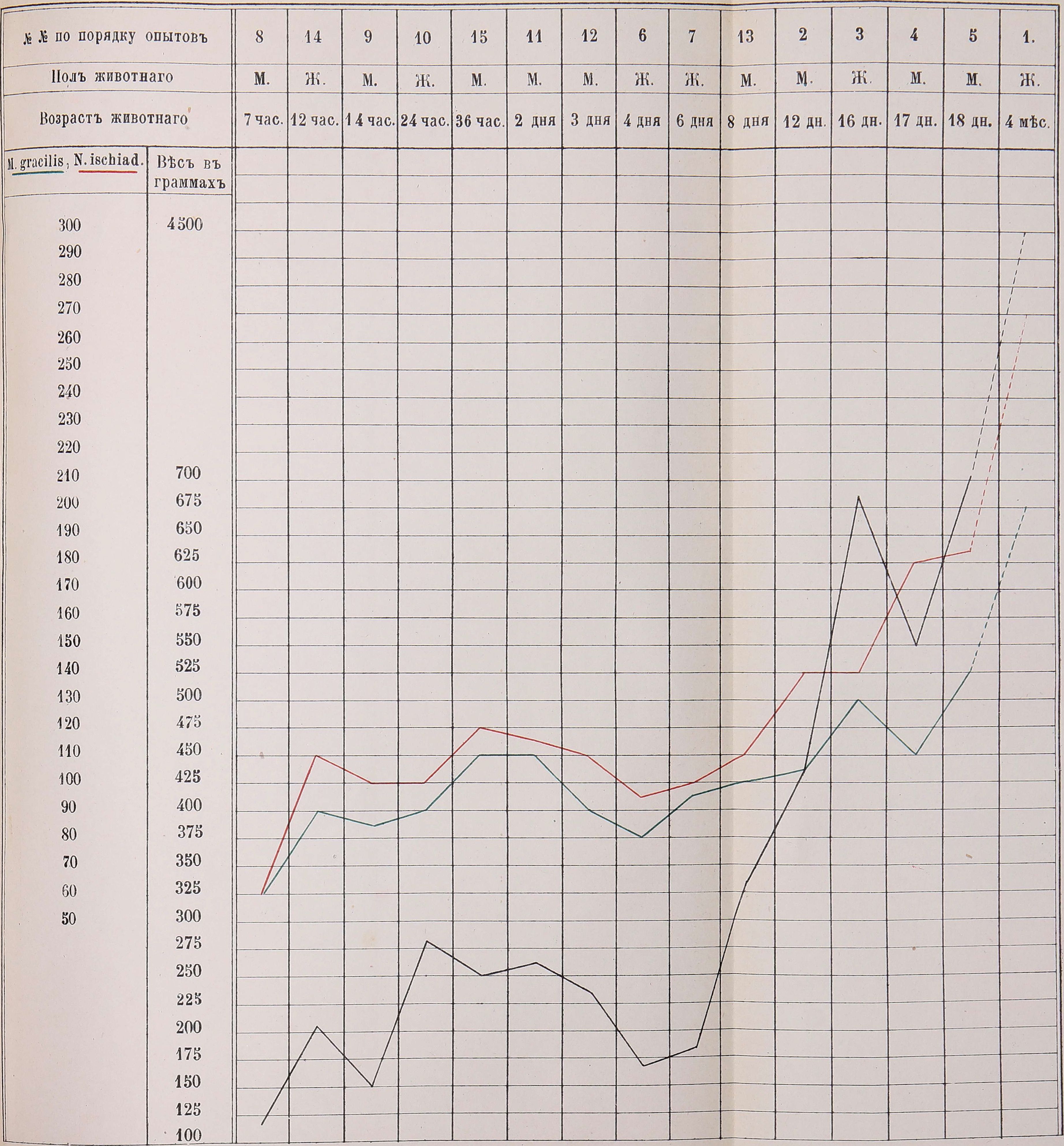 Кривыя, полученныя въ опытахъ надъ животными, съ съ удивительной ясностью указываютъ на почти полный параллелизмъ между вѣсомъ даннаго индивидуума и степенью его электровозбудимости. Несмотря на это, мы однако не рѣшаемся выставлять эту зависимость, какъ нѣчто безусловное, нетребующее новыхъ доказательствъ. Не рѣшаемся сдѣлать этого на томъ основаніи, что матеріалъ, вслѣдствіе недостатка времени не былъ нами искусственно подобранъ; пользовались мы такими щенятами и котятами, которыхъ посылала природа. Однѣ суки рождали сильныхъ, крѣпкихъ щенковъ, съ большимъ вѣсомъ; другія—тщедушныхъ, захудалыхъ, съ очень малымъ вѣсомъ. Такъ, мы видимъ, что щенокъ 24 часовъ жизни (опытъ № 10) чуть-ли не вдвое по вѣсу тяжелѣе, чѣмъ щенокъ 4-хъ дневный (опытъ № 6) или 6-ти дневный (опытъ № 7); повторяемъ, устранить этого мы не могли вслѣдствіе ограниченности времени и полной зависимости отъ того матеріала, который мы получали.