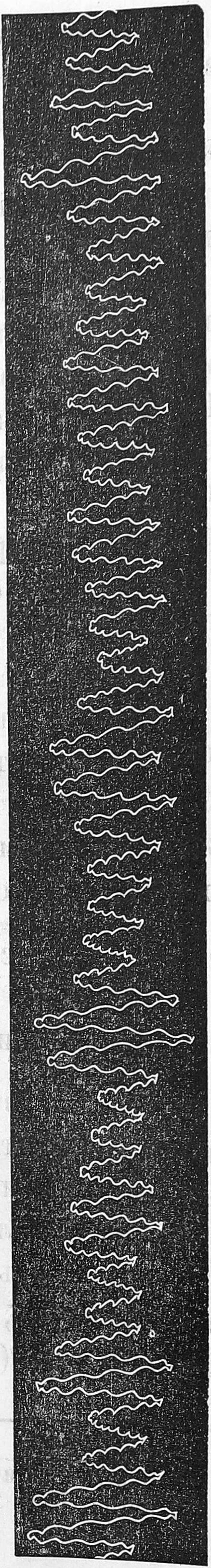 Идеальнымъ приборомъ для изученія глазныхъ движеній былъ бы кинематографъ съ указателемъ времени, но онъ будетъ стоить слишкомъ дорого. Опытъ показалъ мнѣ, что если положить какую-либо легкую пластинку на верхнее вѣко, то при движеніи глаза вверхъ и внизъ она поднимается и опускается. Въ этомъ можно убѣдиться даже просто прикладывая палецъ къ глазу. Для большаго удобства можно приклеить гуммиарабикомъ кусочекъ марли къ верхнему вѣку; отъ марли опущена нитка къ пишущему перу, которое и записываетъ движеніе глаза; если этому перу передать еще колебаніе камертона, то будетъ записано и время. Въ моемъ распоряженіи находился камертонъ, дающій 100 колебаній въ секунду. Каждое колебаніе, соотвѣтствующее 1:100 сек. очень хорошо видно на записанной кривой и даетъ возможность съ весьма большой точностью опредѣлить быстроту движеній глаза. Кривая имѣетъ слѣдующій видъ: