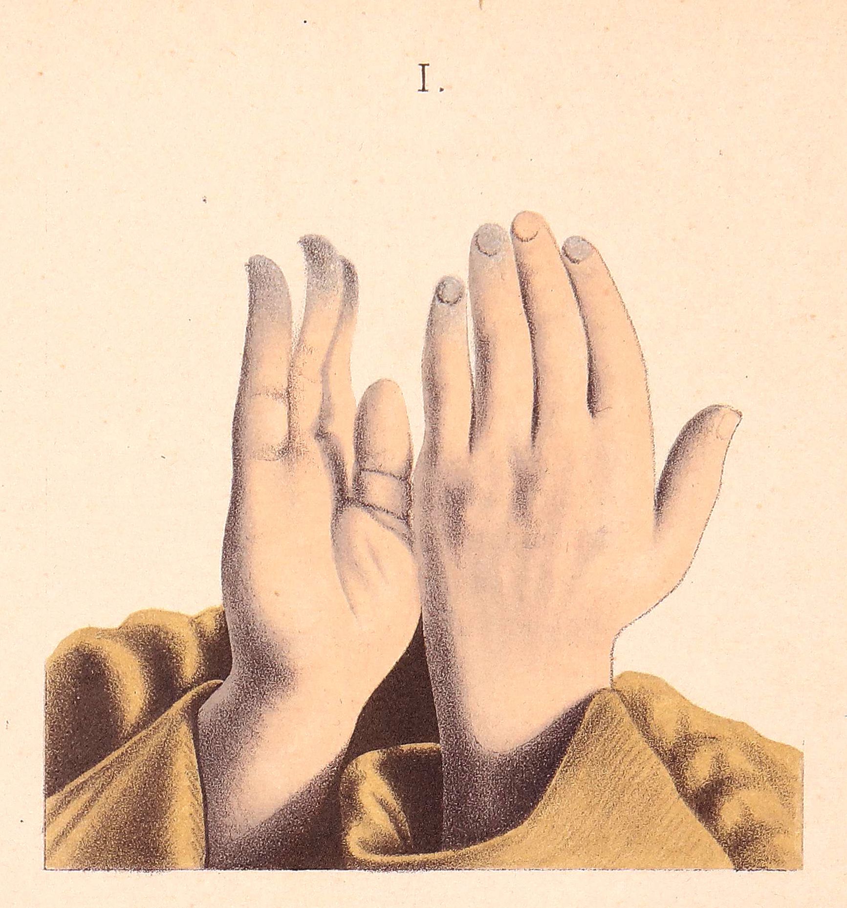 Я не буду описывать дальнѣйшихъ колебаній процесса. Колебанія эти наблюдались въ теченіе болѣзни, это являлось несомнѣннымъ; притомъ нужно замѣтить, что тамъ, гдѣ процессъ зашелъ болѣе или менѣе далеко, наклонность къ колебаніямъ была выражена слабо, какъ это мы наблюдали на указательномъ и среднемъ пальцахъ правой руки; большіе же пальцы на той и другой рукѣ оставались во все время наблюденія совершенно нормальными.