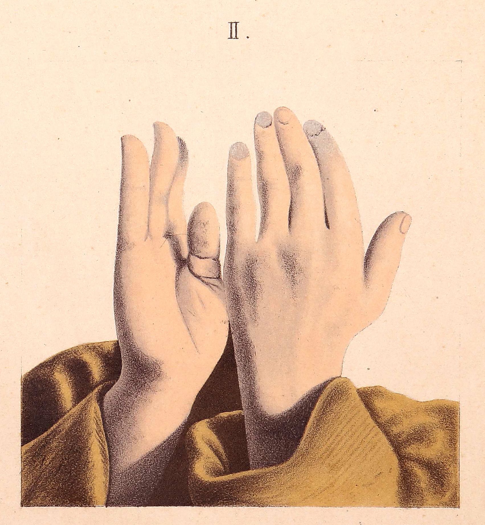 Черезъ 3 дня я опять посѣтилъ больного и наблюдаемая картина болѣзни еще разъ подтвердила, что симптомы не могутъ считаться постоянными, а наклонны къ колебаніямъ въ своей силѣ и довольно обширнымъ. На мизинцѣ и безымянномъ пальцѣ правой руки мы уже не наблюдали прежнихъ явленій: они были нормальны; указательный же и средній оставались по прежнему; на лѣвой—указательный палецъ ухудшался, тогда какъ процессъ на мизинцѣ и безымянномъ видимо шелъ на убыль. (рис. II).
