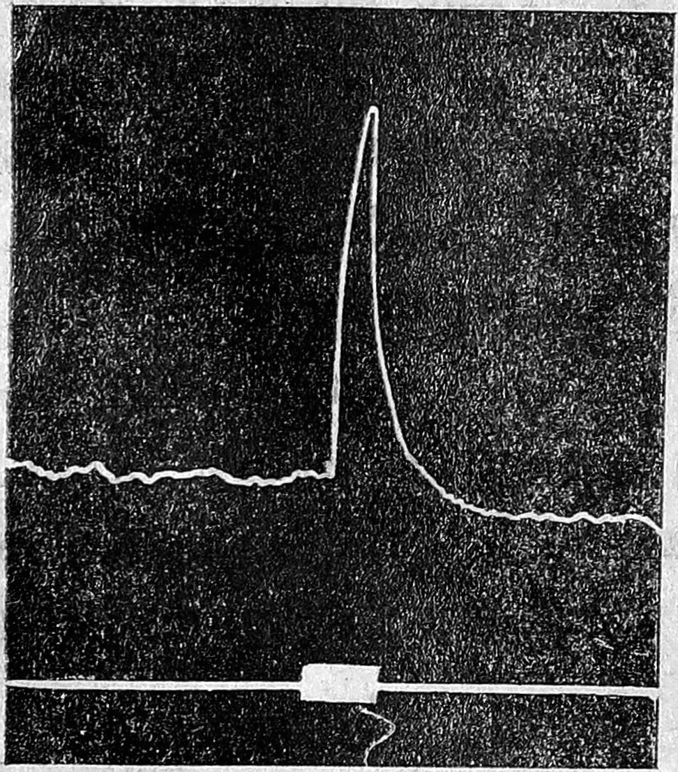 Для записи движеній recti вводился per anum длинный металлическій катетеръ также съ баллономъ на концѣ; и закрѣплялся такъ, чтобы баллонъ находился на глубинѣ 7—9 сант. т. е. выше внутренняго сфинктера. Баллоны выполнялись теплой водой и соединялись обычнымъ для даннаго пріема записи образомъ съ Маревскими капсулами. Для раздраженія нервовъ употреблялись погружные электроды; иногда для цѣлей контроля примѣнялись и ручные электроды. Часть опытовъ поставлена на кураризованныхъ животныхъ, часть на морфивизированныхъ.