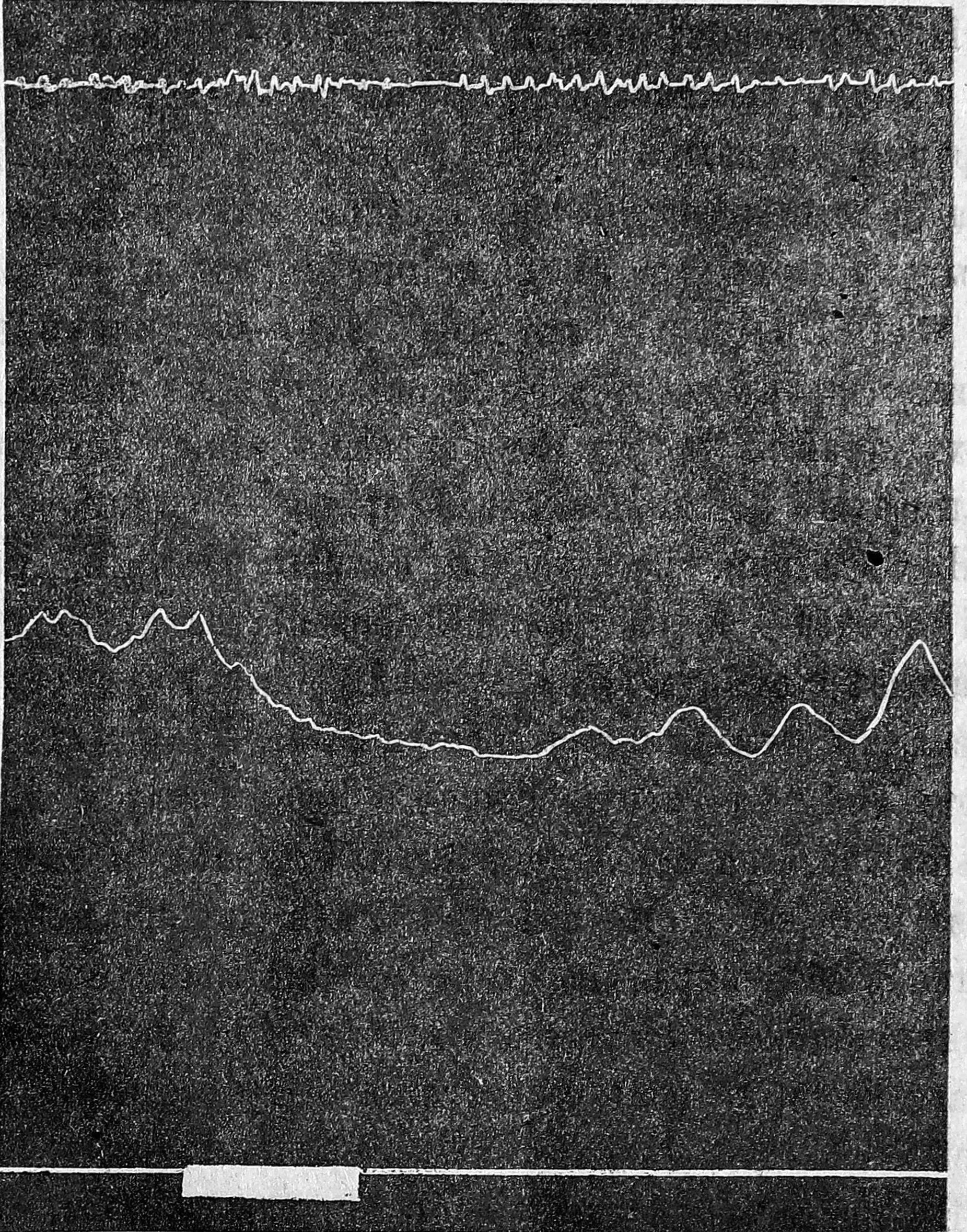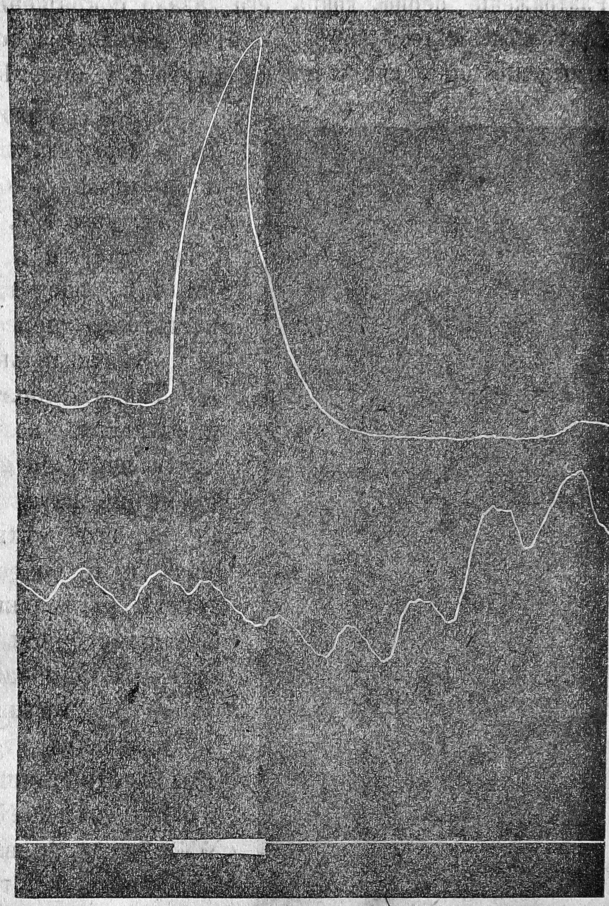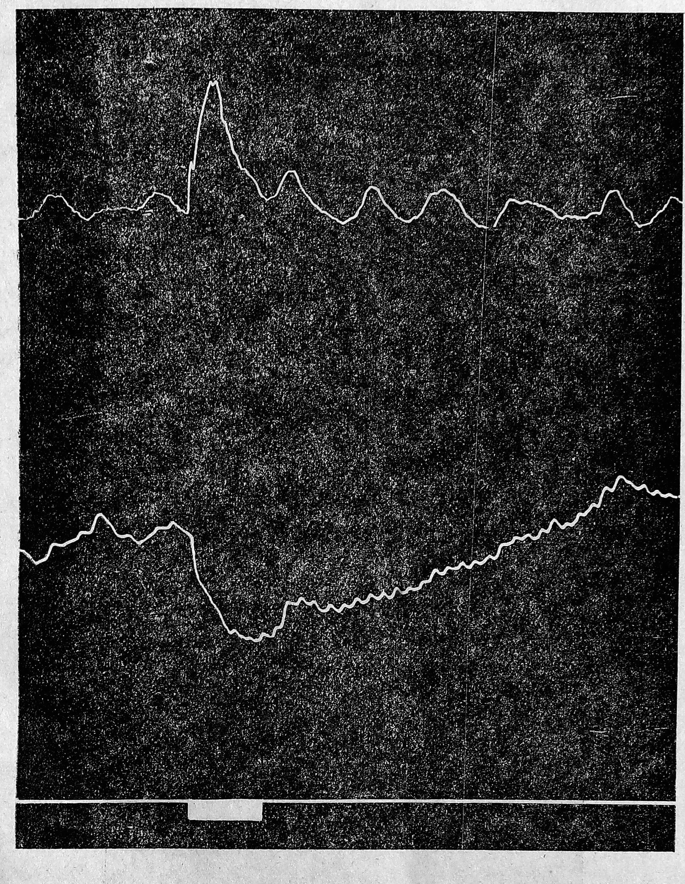 Раздраженіе n. hypogastrici dex. Разст. спир. 70 мм. Морфій. Верхняя запись принадлежитъ пузырю, нижняя-rectum.