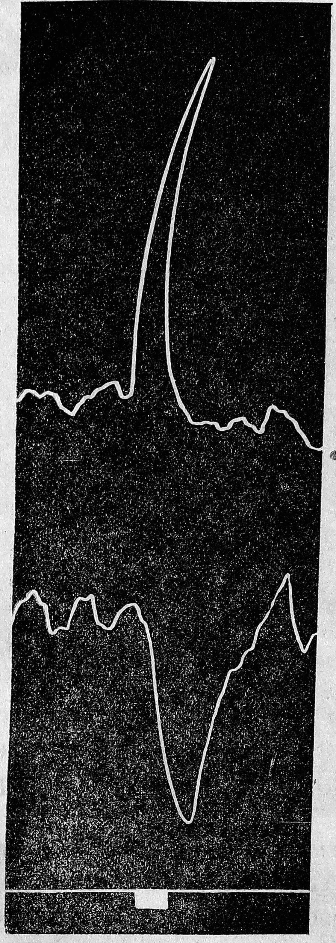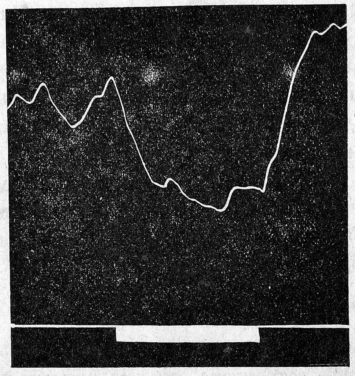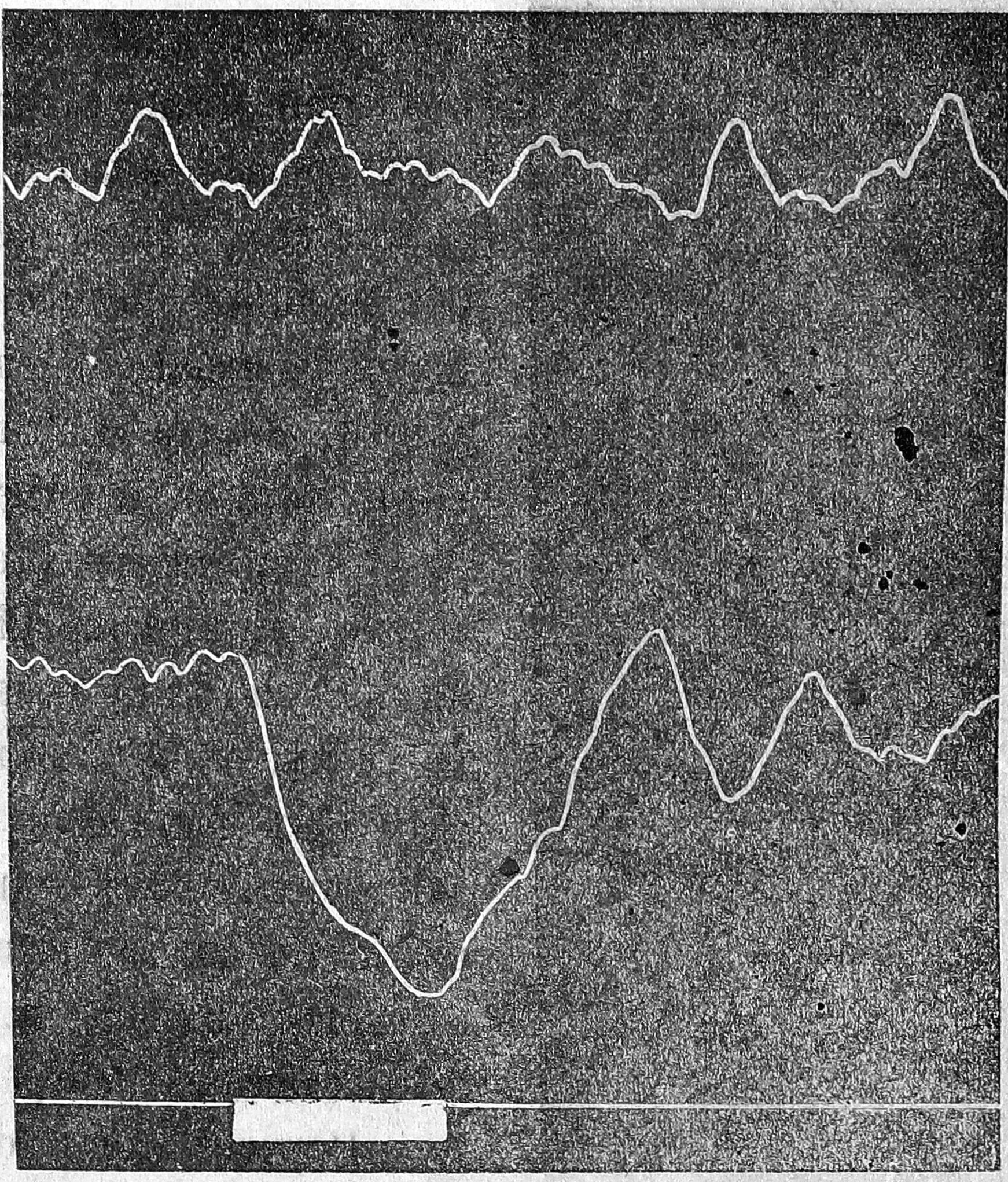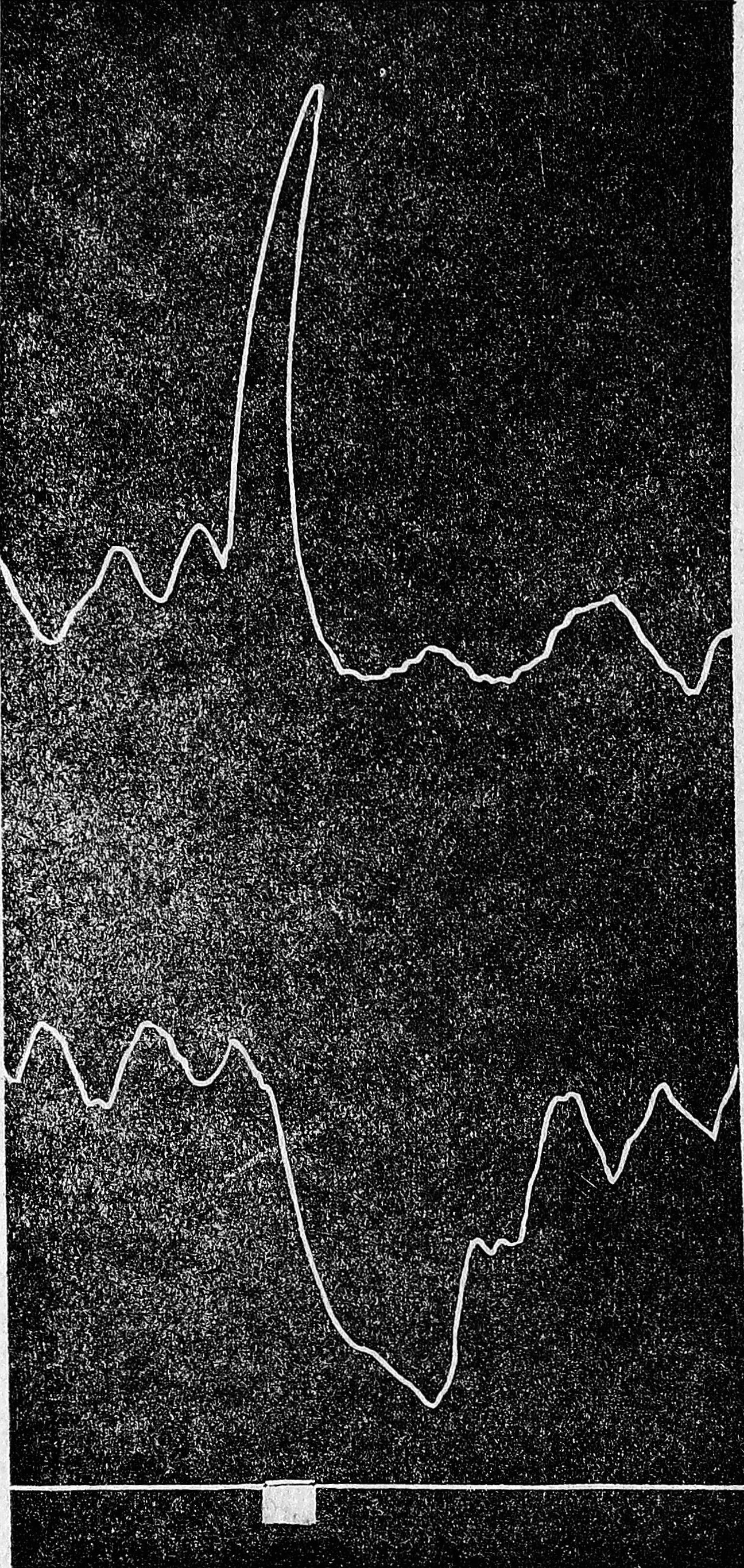 Раздраженіе n. hypogastrici dex. Разст. спир. 70 мм. Морфій. Верхняя запись принадлежитъ пузырю, нижняя-rectum.