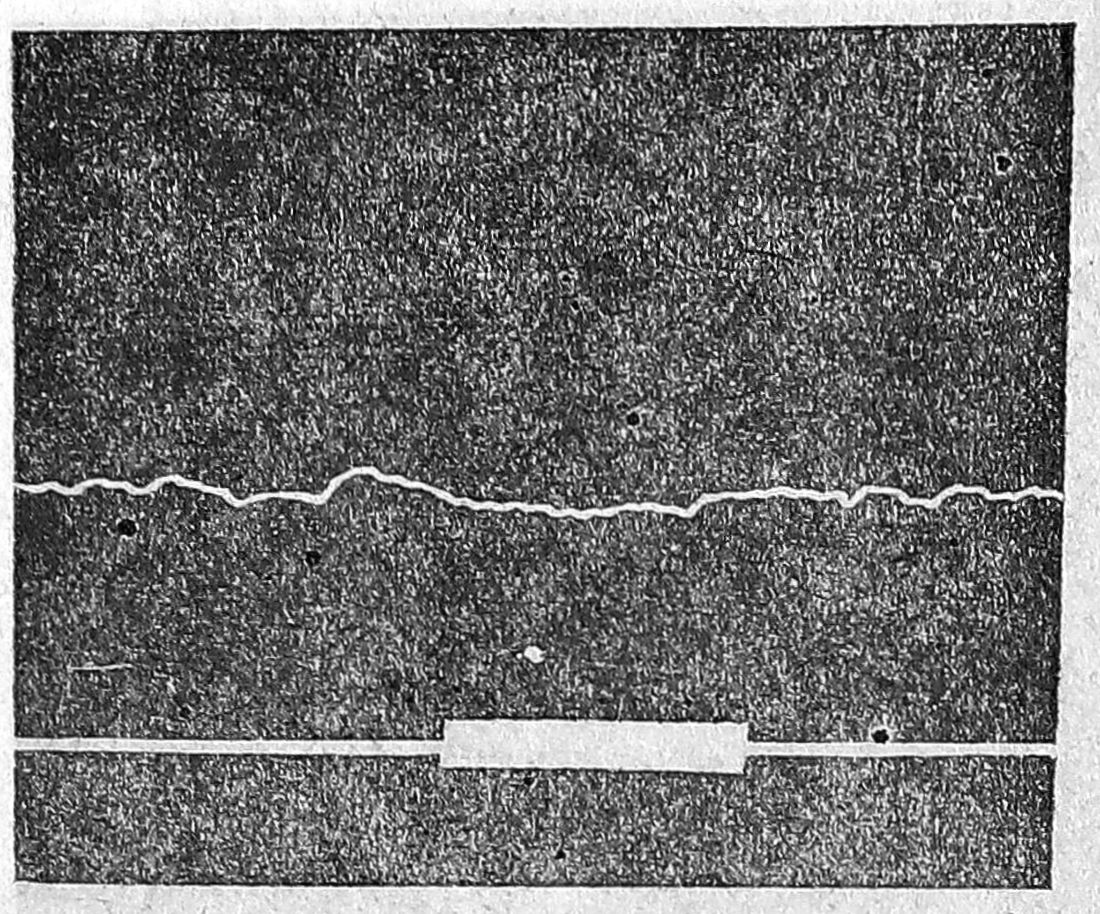 Раздраженіе одного малаго чревнаго нерва (обычно, лѣваго) давало ясное сокращеніе мочевого пузыря; (крив. № 1) лишь въ 2-хъ опытахъ изъ 7 раздраженіе оказалось недѣйствительнымъ.