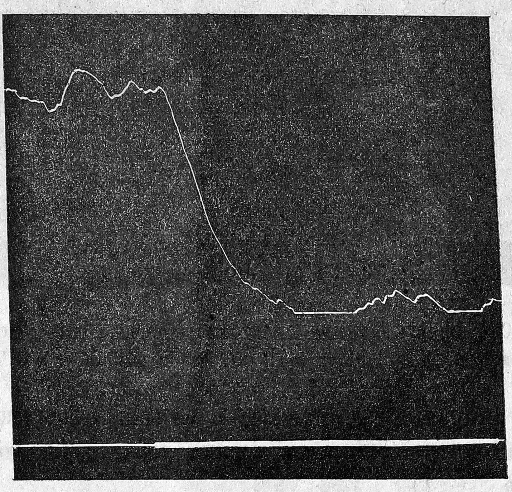 Въ этомъ опытѣ послѣ предварительнаго, пробнаго раздраженія лѣваго большого чревнаго нерва, давшаго обычный результатъ, были перерѣзаны оба n. n. hypogastrici. Раздраженіе чревнаго нерва теперь уже не давало сокращенія пузыря, хотя n. n. erigentes были цѣлы; чтоже касается до rectum, то тормозящій эффектъ хотя и замѣтно ослабъ, тѣмъ не менѣе продолжалъ развиваться въ достаточно отчетливой формѣ, такъ какъ одинъ изъ путей для задерживающихъ волоконъ, именно n. mesent. inf., оставался сохраненнымъ.