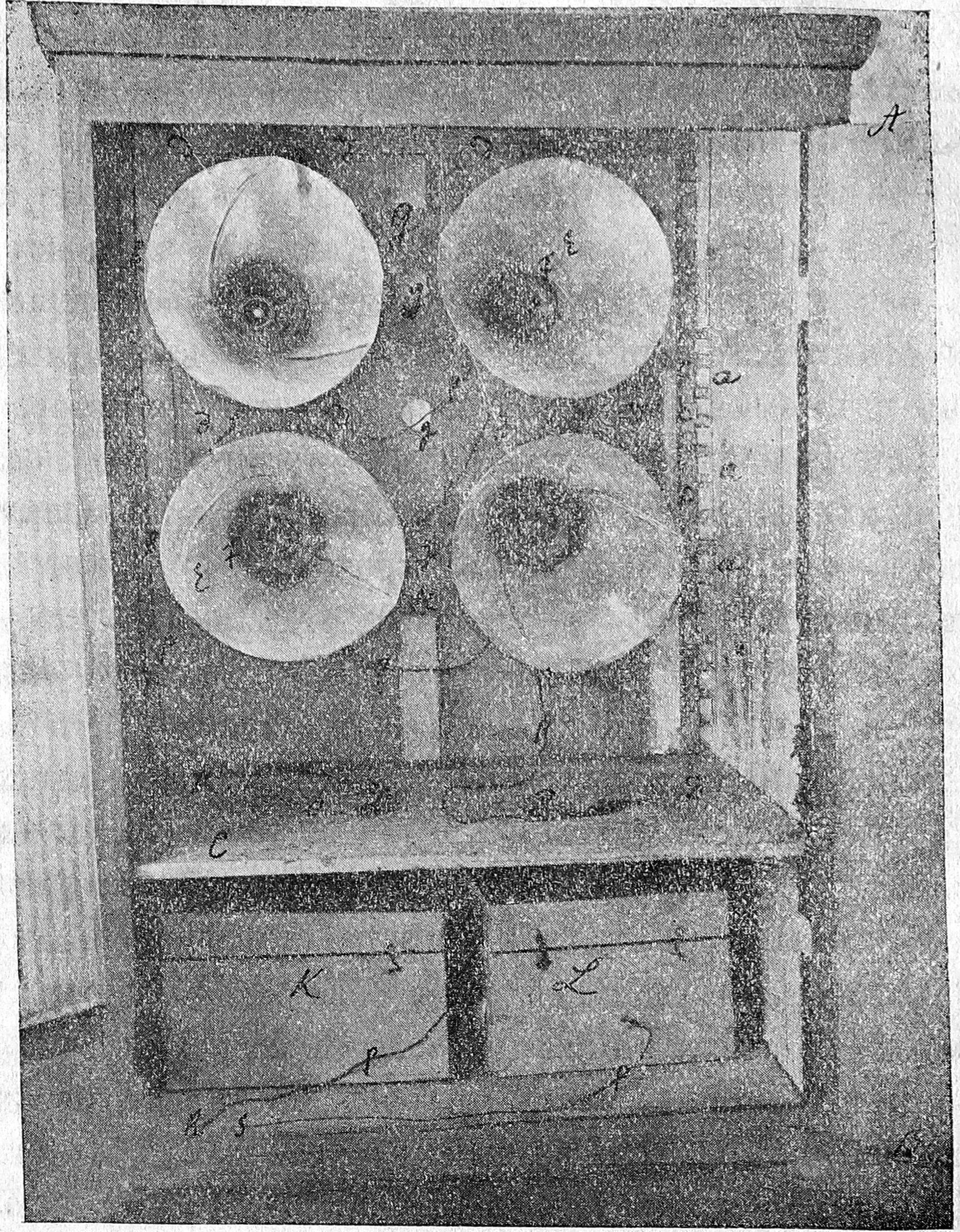 Отъ к перваго микрофона проводъ идетъ чрезъ отверстіе О доскѣ CD (см. рис. 1-ый) къ + полюсу аккумуляторной батареи KL, а отъ 1 4-го микрофона проводъ идетъ чрезъ отверстія Р въ той же доскѣ CD и отверстіе R въ нижней стѣнкѣ шкапа къ телефону, другой проводъ къ телефону идетъ отъ полосы той же батареи KL чрезъ отверстіе S, находящееся въ нижней доскѣ шкапа рядомъ съ отверстіемъ R.