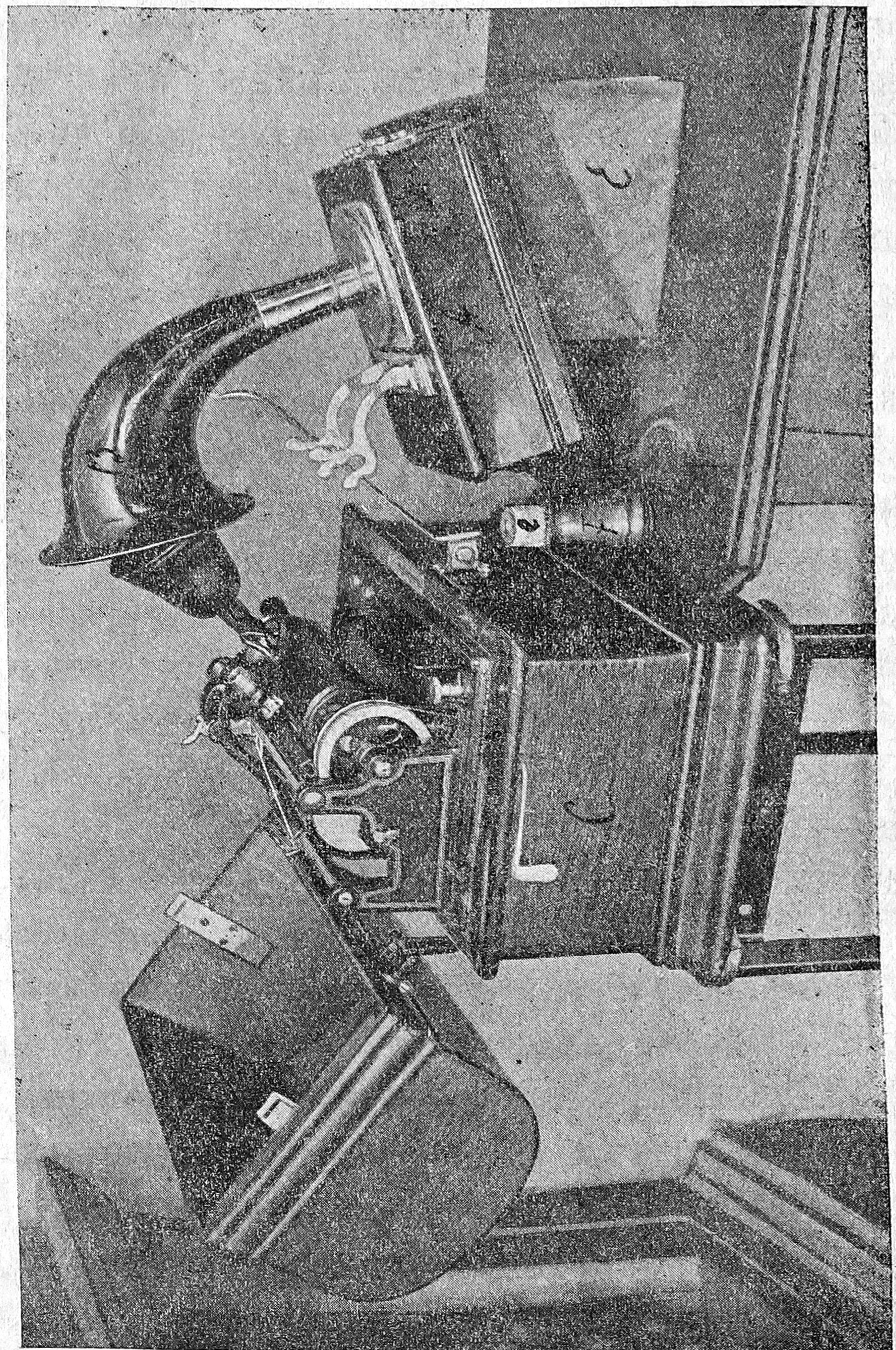 Въ оригиналѣ прибора взятъ фонографъ-диктофонъ вслѣдствіе его побочныхъ преимуществъ напр. болѣе длиннаговалика, позволяющаго конечно болѣе длиную запись, очень ровнаго и малошумнаго хода, возможности легко оріентироваться въ разныхъ отдѣлахъ записи и возможности быстрой смѣны записывающей и воспроизводящей капсулъ, что позволяетъ тотчасъ же послѣ записи безъ промедленія выслушать записанное; послѣднее преимущество вмѣстѣ съ возможностью быстро оріентироваться въ записи особенно важно при научныхъ изслѣдованіяхъ въ томъ отношеніи, что при какой нибудь случайной неясности записи въ смыслѣ звуковъ или въ смыслѣ допущенія различныхъ толкованій помощникъ сигналомъ 15) можетъ дать знать объ этомъ экспериментатору и извѣстный отдѣлъ опыта можетъ быть повторенъ или дополненъ.