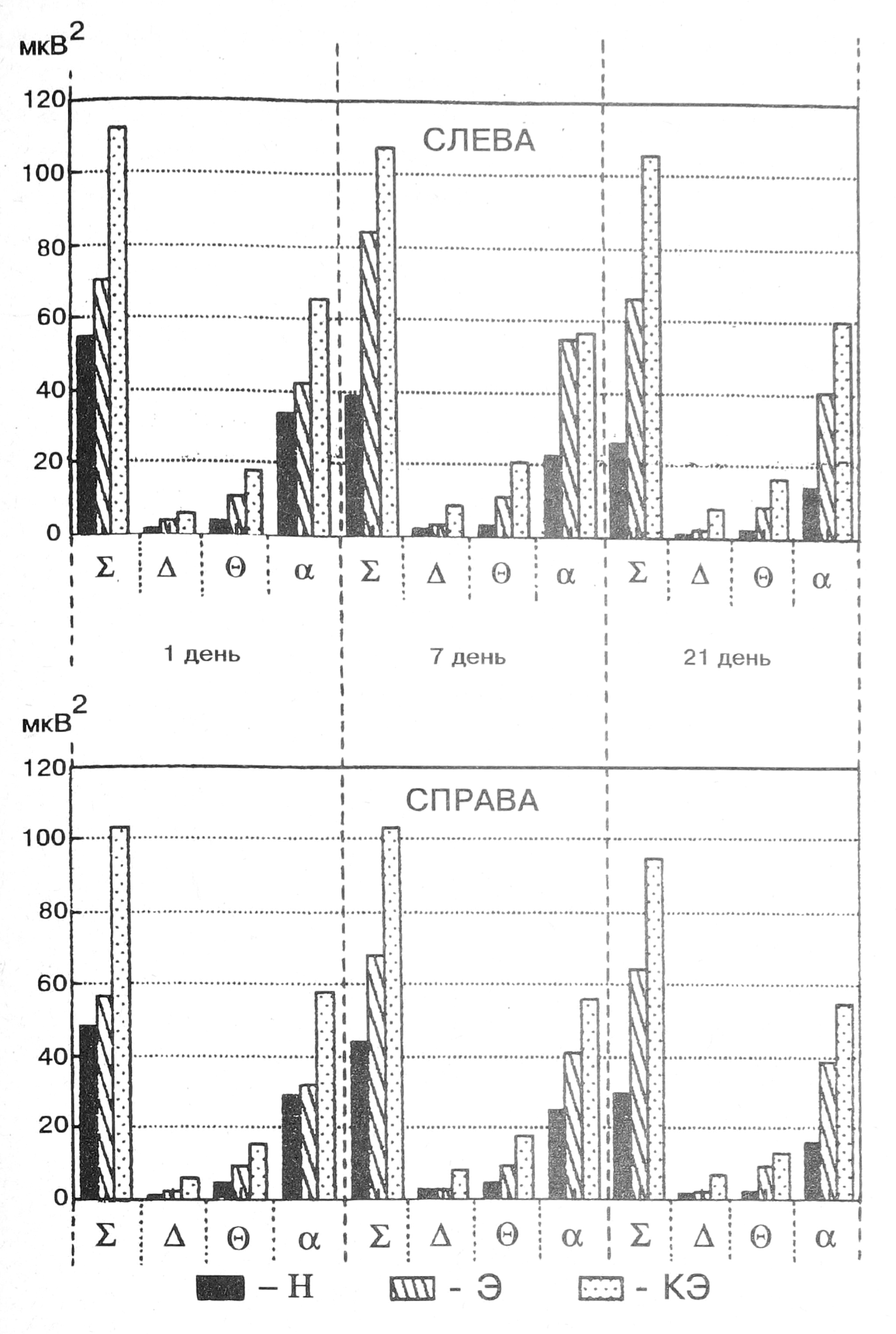 В группе больных с Э суммарная мощность имела наивысшее значение на 7-й день МЦ преимущественно за счет альфа-ритма с обоих отведений и в меньшей степени за счет низкочастотных составляющих спектра (дельта- и тета-). На 21-й день мощность дельта-, тета- и альфа-спектров была ниже, чем на 7-й день, но по сравнению с 1-м днем значения слева были меньше, а справа приблизительно совпадали.