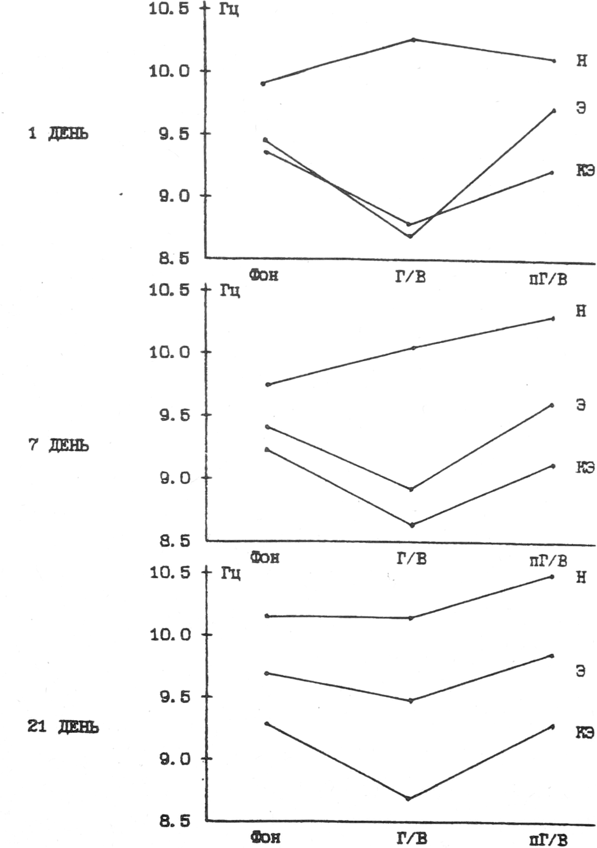 Для оценки нейродинамики головного мозга применялось быстрое преобразование по Фурье. Запись осуществляли в линейном режиме с затылочных монополярных отведений на анализаторе «Берг-Фурье 2037» фирмы «О.Т.Е. Биомедика» (Италия). Оценивали значение суммарной мощности и частотных составляющих с затылочных монополярных отведений в диапазонах 0,5-3,5; 4,0-7,5; 8,0-12,0; 12,5-15,0; 15,5-19,0; 19,5- 32,0 Гц. Соответствующих дельта-, тета-, альфа-, сигма-, бета- 1- и бета-2-активности в стандартных условиях записи (эпоха анализа - 60 с при постоянной времени 0,3). Регистрировали также частоту доминирующего ритма (ЧДР). Исследование проводили трехкратно: в первый день МЦ, в середине фолликулиновой и лютеиновой фаз цикла, что при 28-дневном МЦ соответствовало 7 и 21-му дням. Исходя из большого объема первичного материала мы ограничились анализом данных, полученных на 2-й минуте фоновой записи, соответствующих расслабленному бодрствованию (Ф), на 2-й минуте гипервентиляции (Г/В) и на второй минуте постгипервентиляционного периода (пГ/В) как наиболее характерных. Обследовано 7 здоровых женщин (Н) с благоприятной наследственностью и отсутствием нейроэндокринной патологии (средний возраст — 28,4±2,3); 25 больных с катамениальными (менструальными) эпилептическими (КЭ) припадками (средний возраст 25,2±1,9) и 15 больных эпилепсией (Э), припадки у которых не были связаны с менструальным периодом (средний возраст - 26,2±2,5). По длительности заболевания, тяжести течения, медикаментозному лечению группы Э и КЭ существенно не различались. В обеих группах преобладали больные с височной эпилепсией (в группе больных КЭ незначительно доминировала правосторонняя латерализация эпилептического очага, в группе Э - левосторонняя). Больные с выраженной межполушарной асимметрией либо с умеренной неврологической симптоматикой обследованию не подлежали.