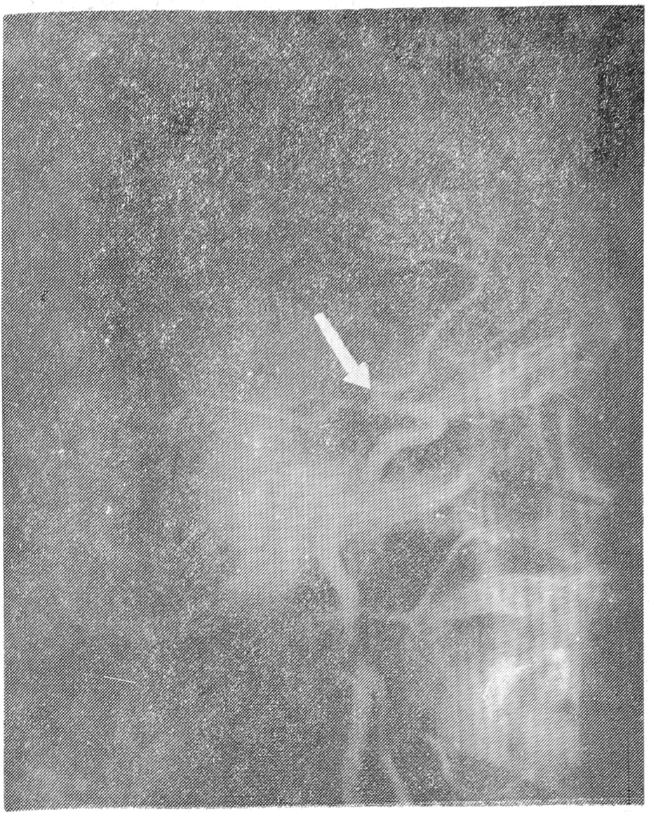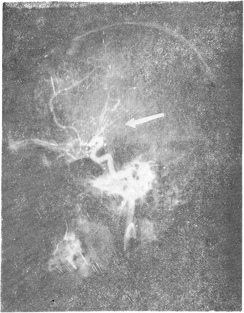 30/10-1984 г. выполнена церебральная ангиография. На левосторонних каротидных ангиограммах в артериальной фазе отмечены конусовидное сужение супраклиноидной части левой внутренней сонной артерии и окклюзия левой средней мозговой артерии в начальной части с развитием бессосудистой зоны в ее бассейне (рис. 1).