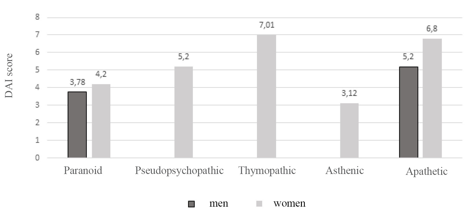 The level of compliance was generally higher in women than in men (7.4 and 5.8 points, according to DAI, respectively). Women with paranoid and apathetic remissions tended to have a higher level of compliance. The most favorable compliance was noted with thymopathic remission in women (7.01 points). In men, the level of compliance was higher in those with apathetic remission than in those with paranoid remission (Fig. 1).