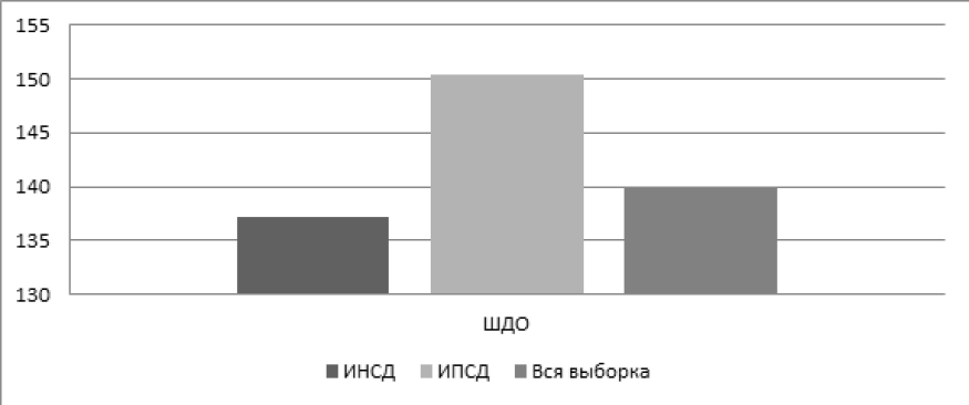 Для исследования особенностей когнитивных искажений у испытуемых была использованы методика А. Эллиса «Диагностики иррациональных установок» и «Шкала дисфункциональных отношений». Было выявлено, что высокая степень (среднее по подгруппе – 150,4 при норме до 139 баллов) выраженности дисфункциональных отношений (рис.2. ) оказалась более характерной для больных ИПСД по сравнению с больными ИНСД (среднее по подгруппе – 137,8 балла), что указывает на большую выраженность у них клинических жалоб и проявлений невротических расстройств. В рамках личностных особенностей у данной категории больных наблюдалась большая степень контроля над своими мыслями, чувствами и поведением, педантичность, зависимость, склонность к рефлексии, самокритичность, а также подавленность настроения [3].