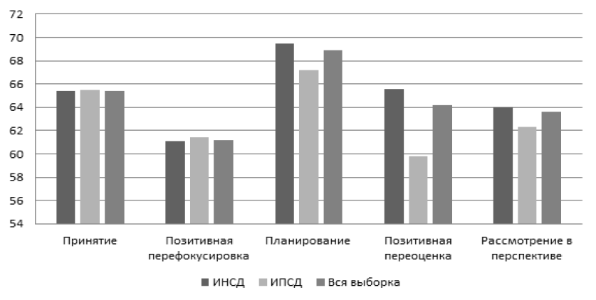 При помощи опросника «Когнитивная регуляция эмоций» Н. Гарнефски и В. Крайга (CERQ) было выявлено (табл. 2) преимущественное использование продуктивных когнитивных стратегий регуляции аффективных переживаний больными СД II типа (рис.4. ), которые способствуют успешной адаптации: «принятие» того, что случилось (среднее в группе – 65,4 соответственно), «позитивная перефокусировка» (среднее в группе – 61,2) с отвлечением мыслей на другие, более приятные события и ситуации вместо размышлений о пережитых затруднениях, «фокусирование на планировании» (среднее в группе – 68,9) с размышлениями о том, какие следующие шаги лучше предпринять по отношению к случившемуся, «рассмотрение в перспективе» (среднее в группе – 63,4), акцентирующее снижение исключительной значимости события за счет его сравнения с другими более сложными ситуациями [4]. Для больных ИНСД была характерна «позитивная переоценка» (среднее в группе – 64,8) с поиском положительного смысла произошедшего события как полезного для приобретения нового опыта. Использование деструктивных стратегий больными СД II типа отмечалось на среднем уровне (рис. 5). При сравнении обеих подгрупп более выраженным оказалось проявление дезадаптивных стратегий у больных ИПСД, в частности, таких как «самообвинение» (55,9±14,1 у больных ИНСД и 58,0±14,5 у больных ИПСД) с чувством вины себя за случившееся; «руминации» со склонностью к постоянным размышлениям о пережитой трудной ситуации (59,24±15,4 у больных ИНСД и 61,3±16,3 у больных ИПСД); «катастрофизации» с обдумыванием глобальных размеров произошедшего события и его отрицательных последствиях (47,24±15,5 у больных ИНСД и 51,2±14,9 у больных ИПСД); «обвинение других» с перекладыванием вины за окружающих (41,9±17,3 у больных ИНСД и 42,4±16,8 у больных ИПСД).