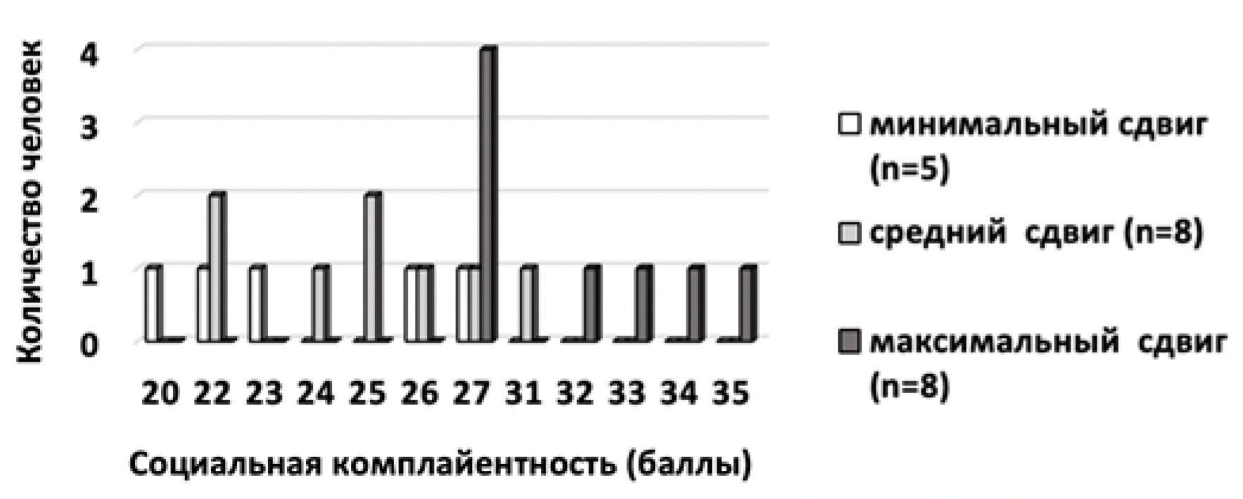 Рис. 3. Частота показателей социальной комплайентности в группах с различной величиной сдвига