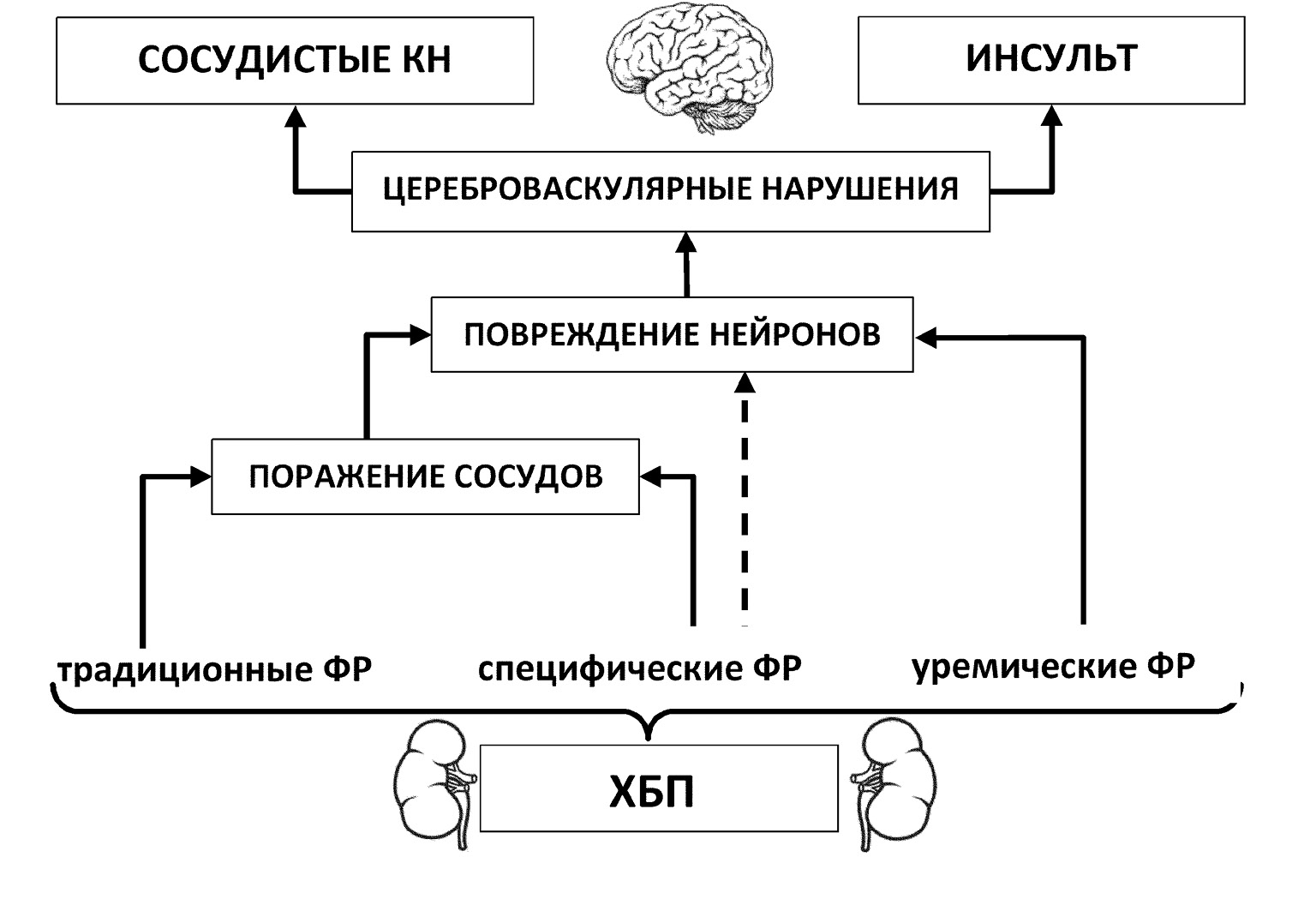 Рис. 1. Патогенез возникновения цереброваскулярных нарушений у пациентов диализного периода терминальной стадии хронической болезни почек (ХБП); КН — когнитивные нарушения; ФР — факторы риска