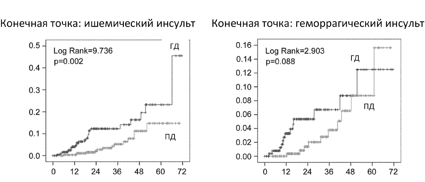 Исходы инсульта у пациентов, находящихся на ПГ. Считают, что пациенты, находящиеся на ПГ, после перенесённого инсульта имеют более высокий риск смертности. Так, Wetmore и соавт. (2014 г., в исследование вошёл 69 371 пациент) сообщают о том, что через 30 дней после инсульта у пациентов, находящихся на ПГ, смертность составила 17,9% в группе ИИ и 53,4% в группе ГИ. Авторы отмечают, что смертность после наступления инсульта с течением времени снижалась (табл. 3) [33].