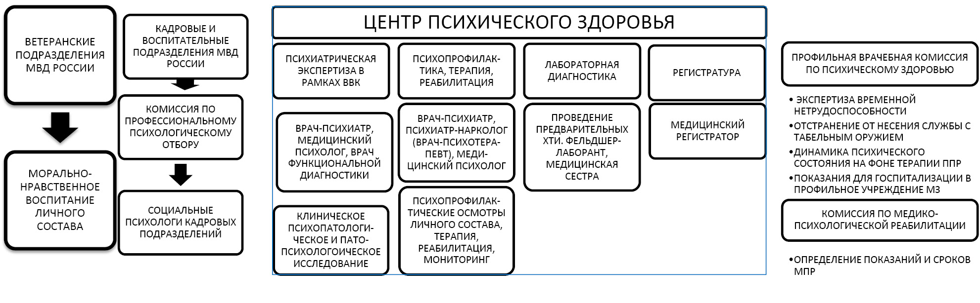 Эффективная организация психопрофилактических мер для сотрудников ОВД с оценкой динамики их психического благополучия, проведения им своевременных медико-психологических реабилитационных мероприятий выходит за рамки компетенции только психиатров и может быть эффективной лишь с позиции комплексного подхода с привлечением специалистов в области медицинской и социальной психологии [3].