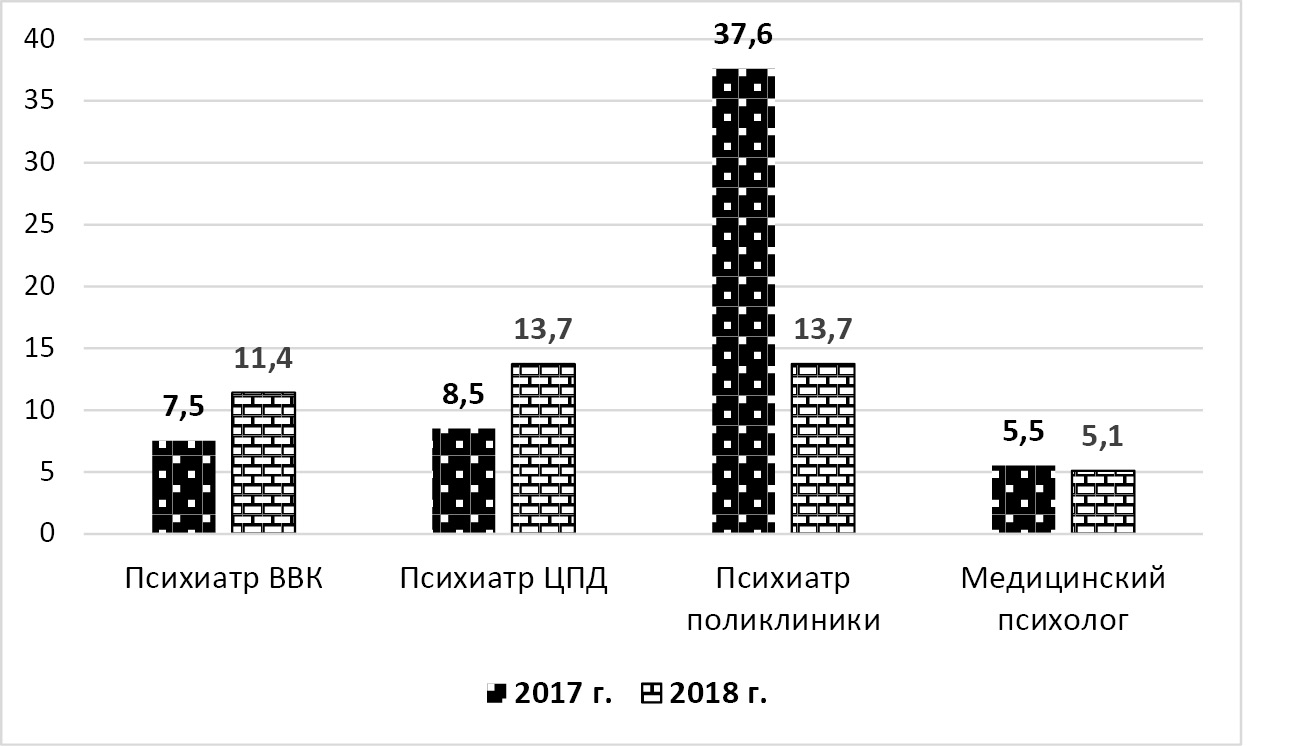 В 2017 г. нагрузка на врача-психиатра поликлиники составляла 37,6 посещения в день, что существенно сказывалось на качестве проводимой работы (краткий ежегодный психопрофилактический осмотр у психиатра из-за ограниченности времени, отсутствия откровенности у обследуемого был малоинформативен