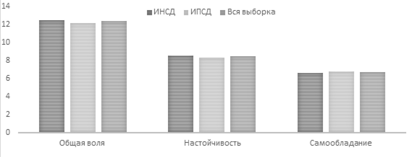 Рис. 2. Индексы волевой саморегуляции у больных сахарным диабетом 2-го типа при различных вариантах его течения по методике «Исследование волевой саморегуляции» А.В. Зверькова и Е.В. Эйдмана (средние значения); ИНСД — инсулиннезависимый сахарный диабет; ИПСД — инсулинопотребный сахарный диабет