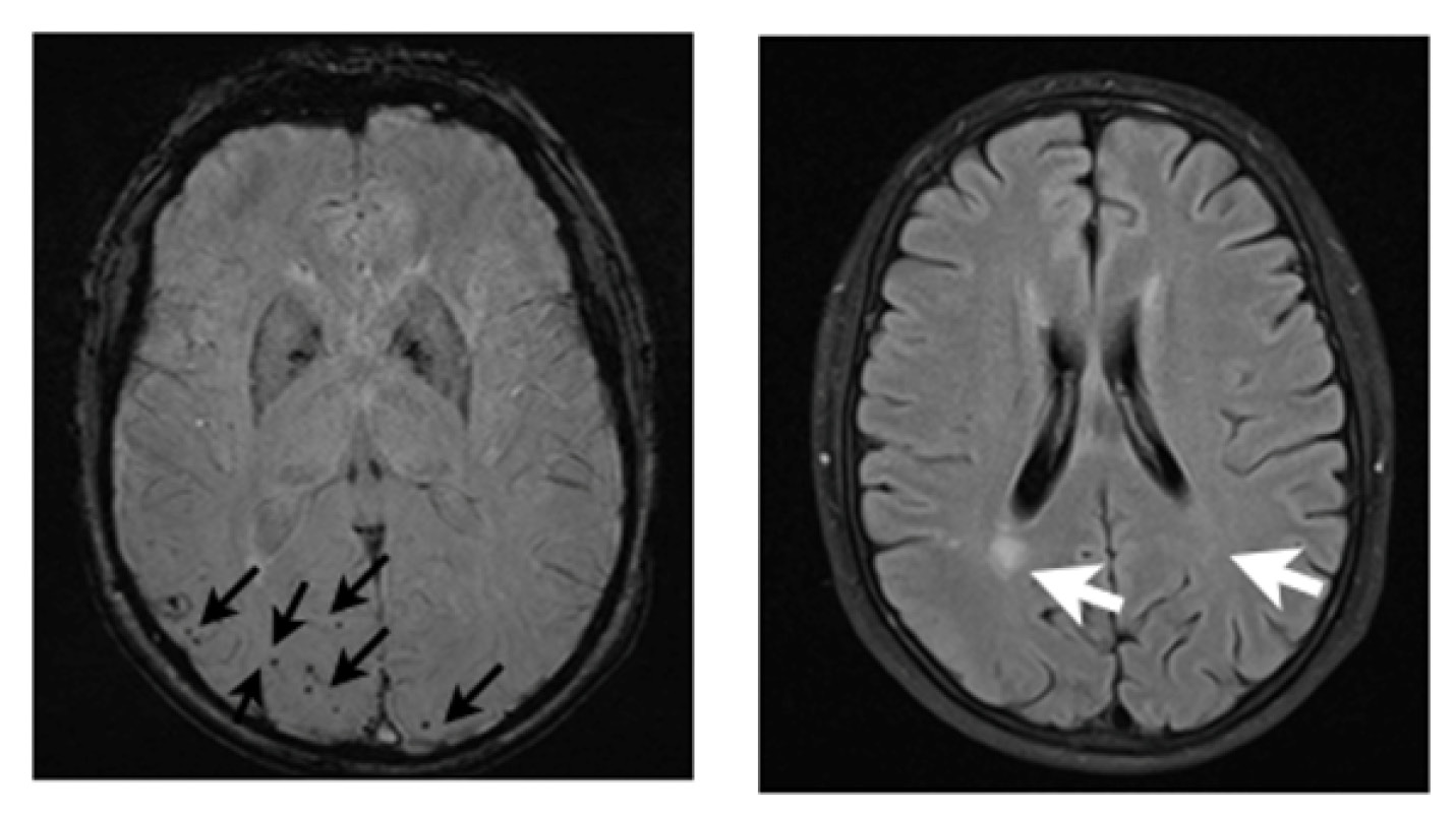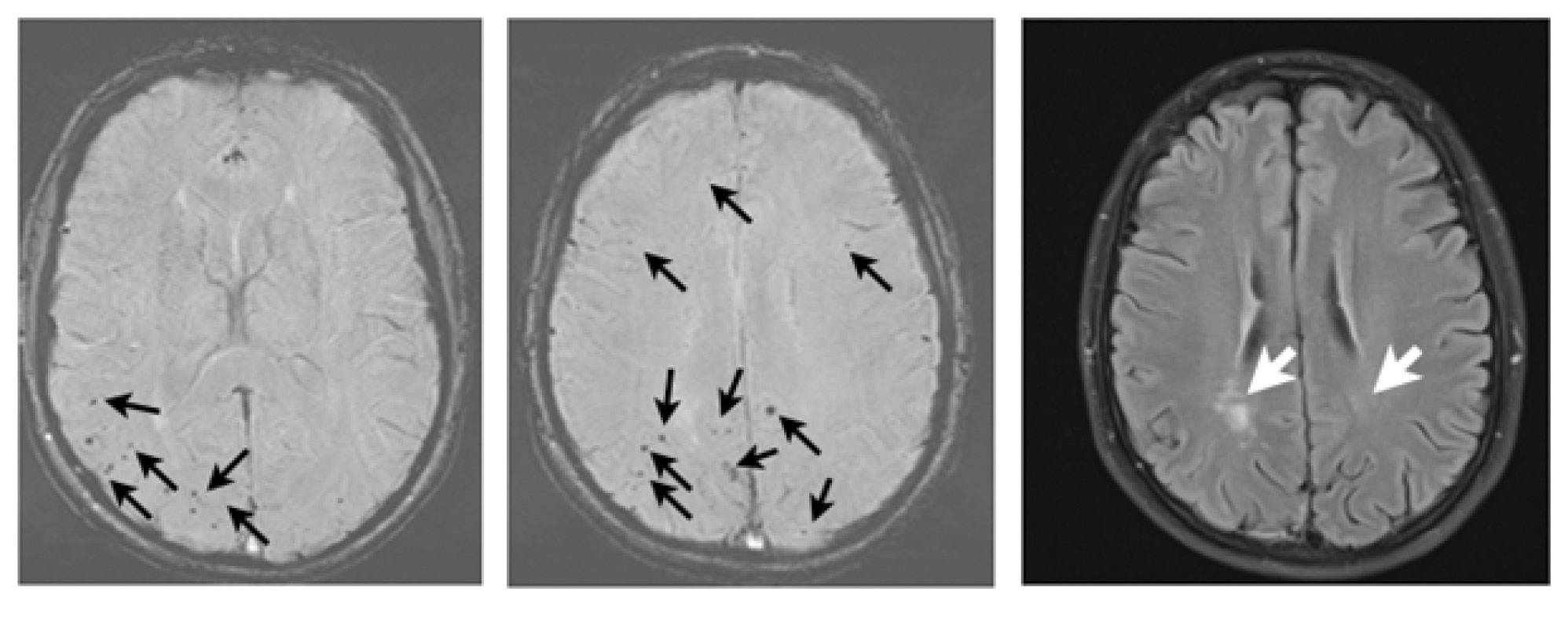 Проведённое нейровизуализационное исследование (МРТ головного мозга, рис. 1) выявило множественные микрокровоизлияния, преимущественно расположенные в правой теменной доле. Также отмечен асимметричный лейкоарайоз — выраженные изменения в правой теменной доле, в значительно меньшей степени в левой теменной доле.