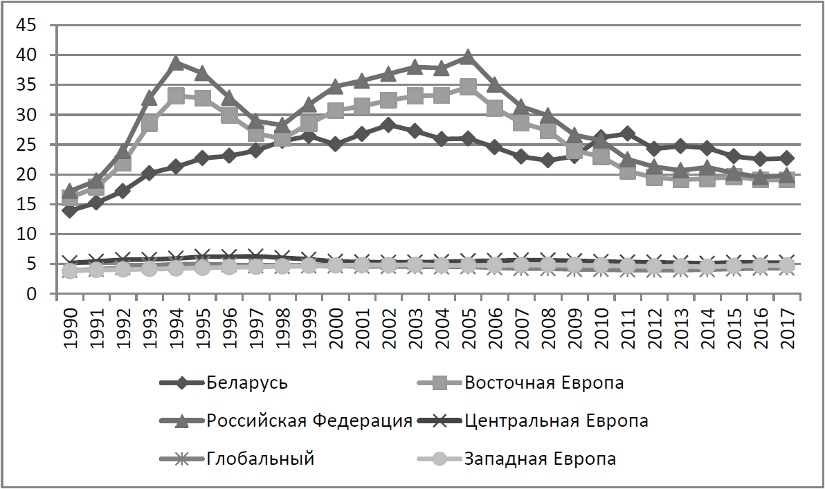 Соответствующий показатель для мира в целом (глобальный) составил 758 на 100 тыс. населения в 2017 г. и имел относительно низкую вариабельность.