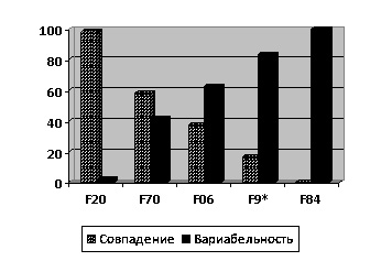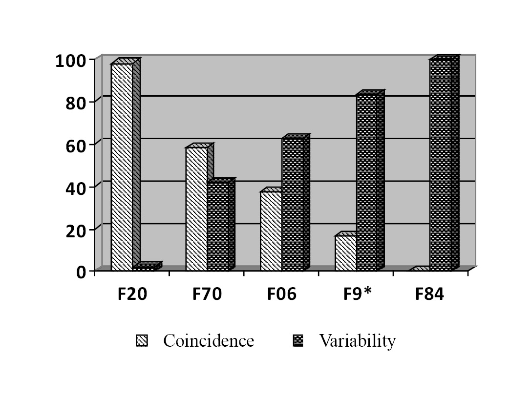 The results of the study were analyzed independently for each group of mental and behavioral disorders. Table 2 shows the results of diagnostic coincidence and inconsistencies in a sample of patients diagnosed with schizophrenia in childhood.