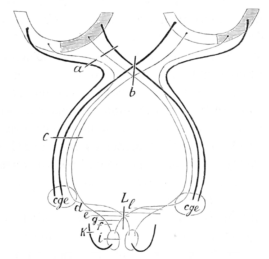 Эти клиническія наблюденія такимъ образомъ, согласно съ данными опытовъ надъ животными, даютъ возможность заключать, что зрачковыя волокна въ chiasma nn. opticorum, подобно зрительнымъ, подвергаются неполному перекрещиванію и затѣмъ позади chiasma, проходя на нѣкоторомъ протяженіи въ tractus opticus, отдѣляются отъ послѣдняго на уровняхъ, приблизительно соотвѣтствующихъ переднему отдѣлу corp, genic. ext., послѣ чего они идутъ къ области дна 3-го желудочка, гдѣ очевидно происходитъ новый обмѣнъ зрачковыхъ волоконъ прежде, чѣмъ они вступятъ въ ядра глазодвигательныхъ нервовъ.