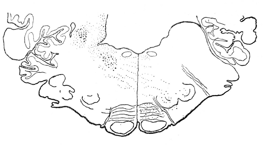 Веревчатое тѣло перерождено на лѣвой сторонѣ отчасти вслѣдствіе поврежденія его самого, отчасти отъ поврежденія ядеръ заднихъ столбовъ. Въ продолговатомъ мозгу перерождена только тыльная половина его и тонкій наружный слой; въ хвостовомъ направленіи оно доходитъ до ядеръ заднихъ столбовъ. По направленію къ мозжечку перерожденіе въ веревчатомъ тѣлѣ увеличивается; въ мозжечкѣ веревчатое тѣло помѣщается между зубчатымъ и шарообразнымъ ядрами, отдавая имъ часть волоконъ, такъ какъ и въ ядрахъ, особенно въ шарообразномъ, имѣются черныя точки. Затѣмъ главный пучекъ веревчаго тѣла идетъ ктылу отъ шарообразнаго ядра по направленію къ верхнему червю. На тѣхъ уровняхъ мозжечка, гдѣ ядеръ уже не существуетъ, перерожденныя волокна веревчатаго тѣла лежатъ въ бѣломъ веществѣ лѣваго полушарія и вступаютъ въ извилины верхняго червя и сосѣднихъ съ нимъ извилинъ полушарія, отчасти переходя и за среднюю линію. Кромѣ того, въ томъ мѣстѣ, гдѣ веревчатое тѣло вступаетъ въ пространство между зубчатымъ и шарообразнымъ ядрами, отъ него отходятъ волокна по направленію къ средней линіи. Эти волокна идутъ ктылу отъ извилинъ нижняго червя, заходя частью въ кровельное ядро своей и, вѣроятно, противуположной стороны. Черныя точки наблюдаются и въ промежуткахъ между шарообразнымъ и кровельнымъ ядрами обѣихъ сторонъ; можно видѣть даже перерожденныя волокна, которыя идутъ черезъ лѣвое кровельное ядро и далѣе черезъ среднюю линію въ правое кровельное ядро; но какое отношеніе всѣхъ этихъ перерожденій къ веревчатому тѣлу, съ увѣренностью сказать трудно.