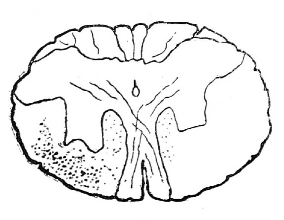 Въ спинномъ мозгу перерожденіе наблюдалось въ боковомъ и въ передне-боковомъ столбѣ на сторонѣ операціи на всемъ его протяженіи до поясничнаго утолщенія; въ шейной и спинной части перерожденіе существовало и въ переднихъ столбахъ той и другой стороны. Кромѣ того Biedl наблюдалъ перерожденіе переднихъ корешковъ спинного мозга.