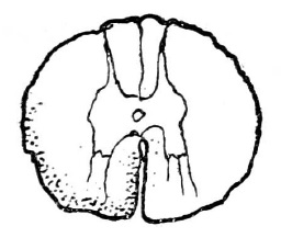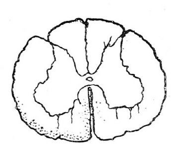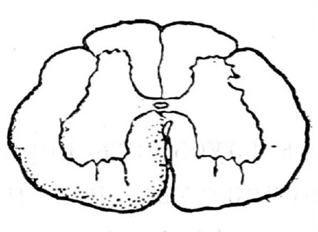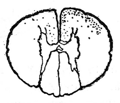 - сплошное перерожденіе средней ножки, причемъ перерожденіе уменьшалось по направленію ко шву; нѣкоторыя волокна моста переходятъ черезъ шовъ и теряются между пирамидными пучками, а другія идутъ ктылу отъ пирамидныхъ пучковъ той-же стороны (стороны операціи) и проникаютъ въ петлю, а отсюда вмѣстѣ съ нею идутъ въ переднебоковой столбъ спинного мозга;