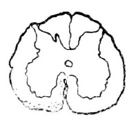 Нѣсколько выше шейнаго утолщенія второго слоя уже не удается отличить отъ перваго, который здѣсь занимаетъ не только всю переднюю периферію передняго столба, но переходитъ такой-же тонкой полосой и на внутренюю периферію его, прилежащую къ передней щели, причемъ онъ занимаетъ около одной трети ея. Въ боковомъ столбѣ расположеніе переднебоковой системы остается прежнимъ Въ шейномъ утолщеніи она занимаетъ три четверти внутренней периферіи и всю переднюю периферію передняго столба; въ боковомъ столбѣ положеніе ея также измѣняется, такъ какъ на этомъ уравнѣ она и въ боковомъ столбѣ лежитъ тонкимъ слоемъ по периферіи, не отходя вглубь, какъ это было на болѣе высокихъ уровняхъ. Въ общихъ чертахъ такимъ-же остается расположеніе передне-краевой системы и въ дальнѣйшемъ ея пути: грудной части, поясничномъ утолщеніи и даже ниже его, съ тѣмъ только различіемъ, что по мѣрѣ удаленія отъ мѣста поврежденія количество перерожденныхъ волоконъ становится все меньше и меньше.