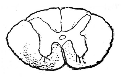 Веревчатое тѣло оказывается поврежденнымъ очень мало, исключительно въ тыльномъ своемъ отдѣлѣ; это перерожденіе оканчивается уже на уровнѣ моста.