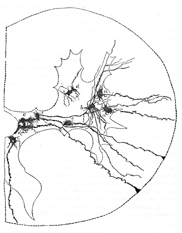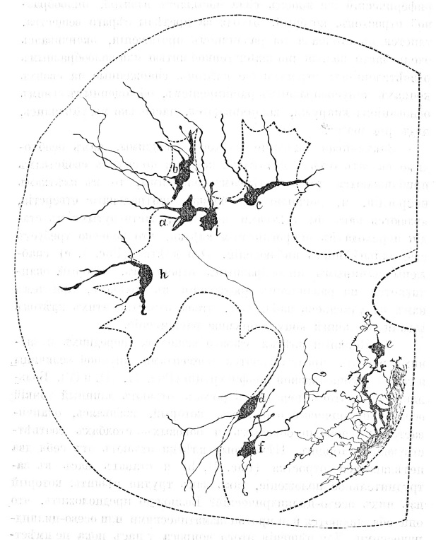 3 Что касается клѣтки d, нанесенной на томъ же рисункѣ, то мы затрудняемся сказать съ положительностью, что это клѣтка нейрогліи.