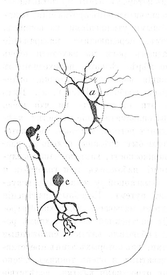 Клѣтки локализируются въ области передне-боковыхъ и боковыхъ столбовъ, располагаясь иногда то вблизи ріа mater, то подъ ріа mater, образуя перимедуллярный слой (Рис. VI, а). Около наружной части заднихъ роговъ мы наблюдали клѣтки, которыя посылаютъ отъ себя осево-цилиндрическій отростокъ; этотъ отростокъ, входя въ сѣрое вещество заднихъ роговъ, отдаетъ отъ себя небольшую вѣточку, самъ же, направляясь дальше, заканчивается въ переднемъ отдѣлѣ задняго рога (Рис. VI, с).