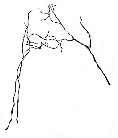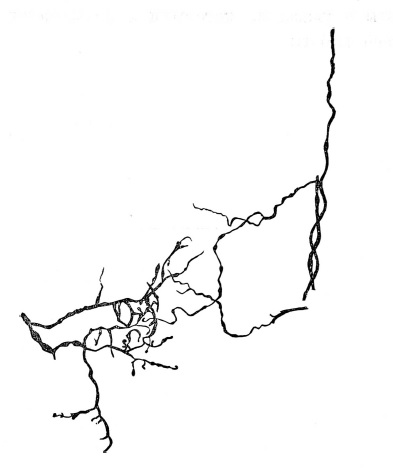 Заканчивая описаніе нервныхъ клѣтокъ, мы перейдемъ къ описанію коллатералей бѣлаго вещества. Коллатерали отходятъ отъ волоконъ бѣлаго вещества то въ горизонтальномъ, то въ косомъ направленіи, при чемъ въ однихъ случаяхъ онѣ являются гладкими, въ другихъ же снабжены варикозными расширеніями. Коллатераль бываетъ или одиночною (Рис. VII), или дѣлится на двѣ-три гладкія или варикозныя нити, которыя, извиваясь въ бѣломъ веществѣ, тянутся на значительномъ протяженіи (Рис. VIII). Что касается волоконъ, отъ которыхъ отходятъ коллатерали, то они представляются толстыми, извитыми и варикозными.