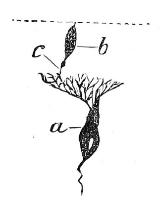 Fig. III. Препаратъ сѣтчатки совы (методъ Golgi-Cajal’я), биполярн. клѣтки съ сильно развитымъ кустикомъ, палочка, с) палочковидное удлиненіе основанія ножки. Соприкосновеніе между ними производитъ впечатлѣніе органич. соединенія.