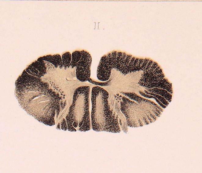 Въ слѣдующемъ 1882 году Kahler[12]) сдѣлалъ наблюденія относительно измѣненій спинного мозга послѣ медленнаго его сдавленія. Названный авторъ въ своей работѣ остановился, главнымъ образомъ, на заднихъ столбахъ и установилъ впервые тотъ фактъ, что непосредственно надъ поврежденіемъ область перерожденія занимаетъ наружные отдѣлы заднихъ столбовъ, прилегающіе къ внутреннему краю заднихъ роговъ; но направленію кверху перерожденныя волокна постепенно отодвигаются внутрь къ серединной линіи, а еще выше перерожденіе ограничивается уже только треугольной областью, занимающей задне-внутренній отдѣлъ заднихъ столбовъ. На основаніи своихъ наблюденій Kahler приходитъ къ тому заключенію, что нѣтъ основаній въ заднихъ столбахъ различать пучки Голля и основные пучки заднихъ столбовъ (пучки Бур- даха); разница состоитъ лишь въ томъ, что въ Годлевскихъ пучкахъ содержится меньше короткихъ волоконъ, чѣмъ въ остальной части заднихъ столбовъ.