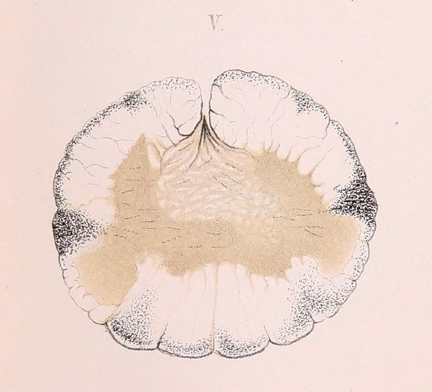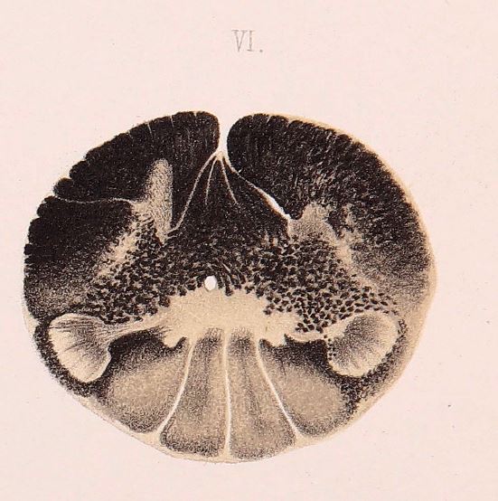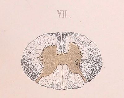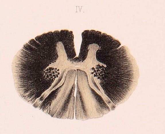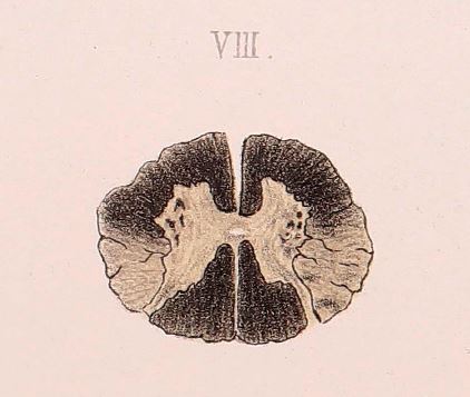 Задніе корешки въ случаѣ автора въ предѣлахъ крестцоваго и поясничнаго отдѣловъ представлялись рѣзко измѣненными. Общая масса этихъ корешковыхъ волоконъ шла черезъ студенистое вещество къ основанію задняго рога и какъ бы въ предѣлы передняго рога. Въ задней спайкѣ не было черныхъ глыбокъ, что, по автору, должно говорить, повидимому, противъ допущенія прямого перехода корешковыхъ волоконъ на противоположную сторону спинного мозга. Начиная съ 12 грудного сегмента, задніе корешки, входящіе вновь въ вещество спинного мозга, оказывались уже совершенно нормальнаго вида, и измѣненными представлялись только волокна заднихъ столбовъ, входящія въ сѣрое вещество заднихъ роговъ. Въ верхнихъ отдѣлахъ спинного мозга наблюдалось только перерожденіе пучковъ Голля. Были обнаружены также измѣненія въ переднихъ корешкахъ на ихъ пути по веществу спинного мозга въ предѣлахъ крестцоваго и поясничнаго отдѣловъ. Эти восходящія измѣненія въ переднихъ корешкахъ авторъ ставитъ въ зависимость отъ пораженія caudae equinae и приравниваетъ ихъ къ тому измѣненію, которое наблюдается въ двигательныхъ черепныхъ нервахъ при поврежденіи ихъ периферической части.