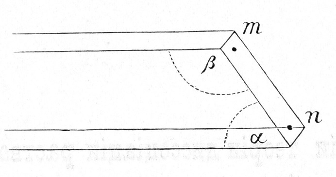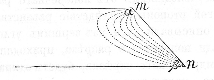 Предположимъ, что у насъ отведенъ токъ отъ точекъ m и n, лежащихъ на поверхности поперечнаго разрѣза у самой вершины угловъ α и ß. Такъ какъ поверхность поперечнаго разрѣза совершенно симметрична и одинакова у вершинъ обоихъ угловъ, то количество СО3Н2, развиваемой въ томъ и другомъ мѣстѣ, тоже одинаково, но у вершины тупого угла іонамъ представляется больше простора, уголъ разхожденія силовыхъ линіи здѣсь гораздо больше, слѣд, скученность и взаимное отталкиваніе іоновъ, т. е. осмотическое давленіе, меньше, и при томъ во столько разъ, во сколько уголъ ß больше угла α, т. е.