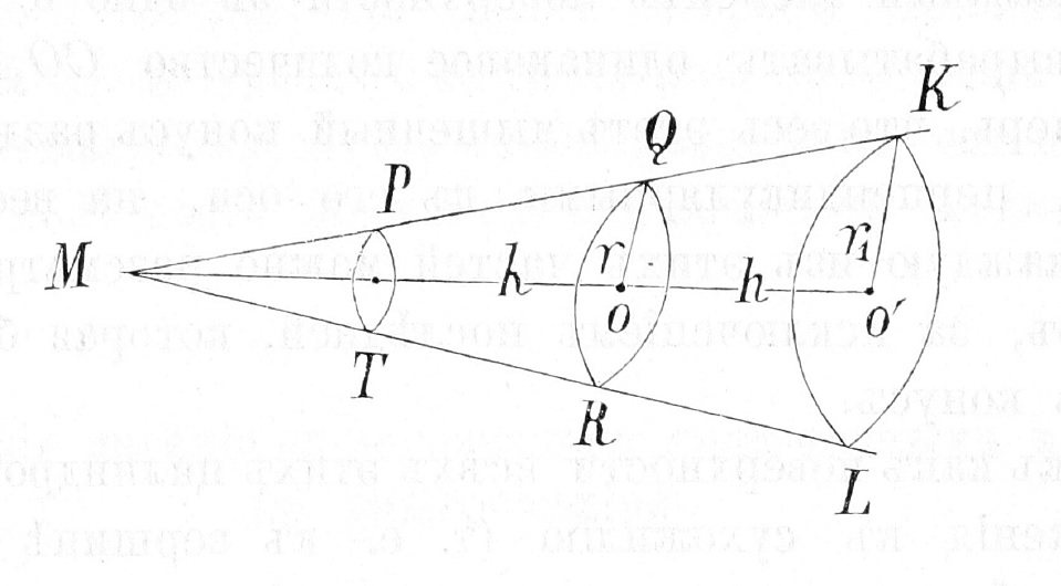 Не трудно найти соотношенія между поверхностью и объемомъ каждаго изъ этихъ цилиндровъ. Возьмемъ, напр., усѣченный конусъ PQRT и будемъ разсматривать его, какъ цилиндръ, котораго высота=h, а радіусъ основанія=r. Если уголъ PMO, который образуетъ боковая поверхность нашего конуса съ его осью, обозначимъ черезъ α, а разстояніе основанія разсматриваемаго цилиндра отъ вершины конуса МО черезъ H, то r = Htgα. А потому искомая поверхность цилиндра: