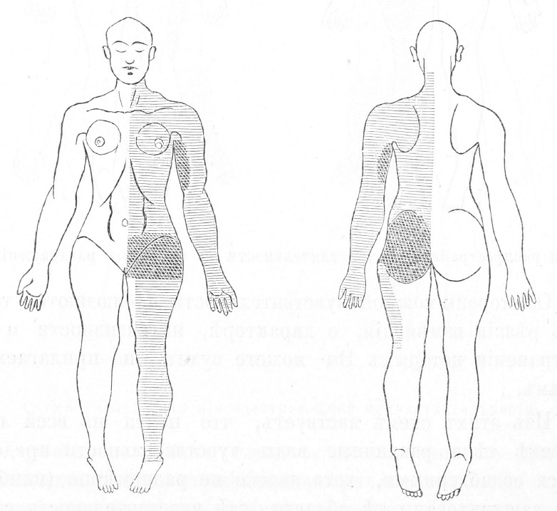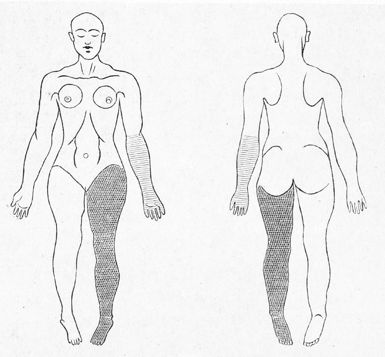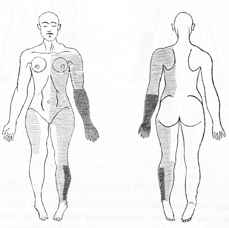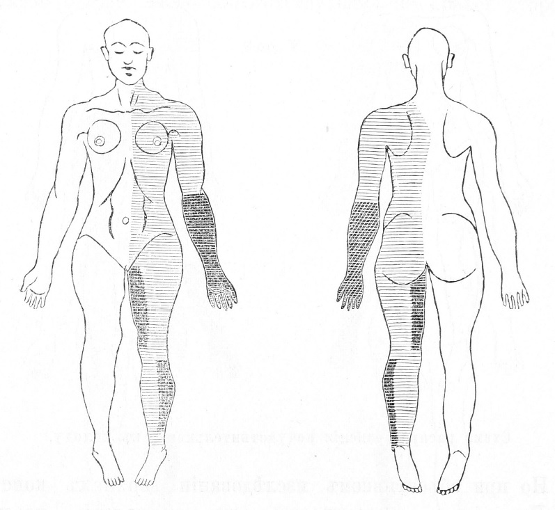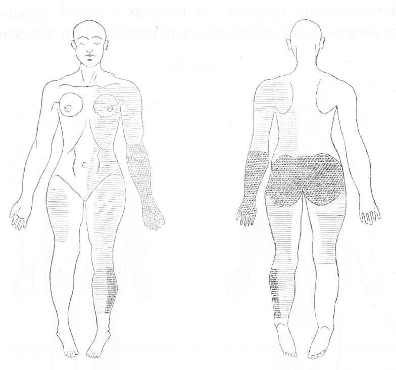 Со стороны кожной чувствительности наблюдаются также очень рѣзкія измѣненія, о характерѣ, интензивности и распространеніи которыхъ Вы можете судить по прилагаемымъ схемамъ.