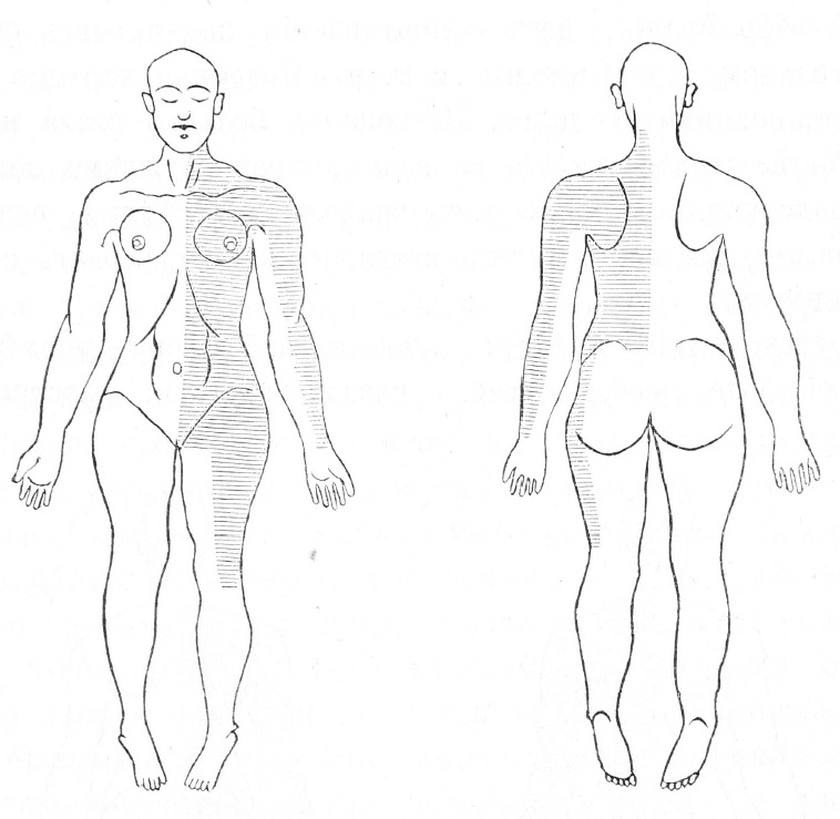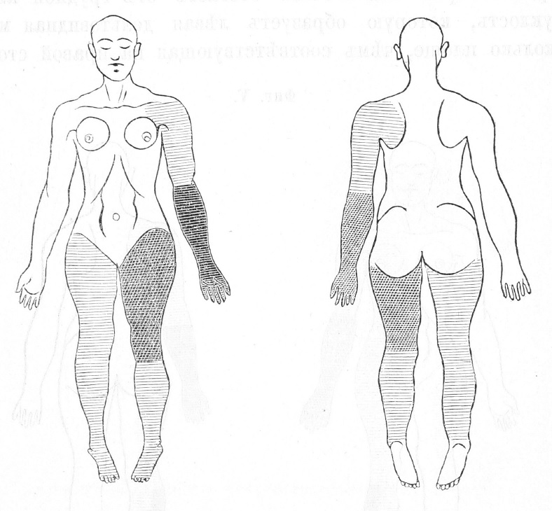 Изъ этихъ схемъ явствуетъ, что почти на всей лѣвой половинѣ тѣла различные виды чувствительности представляются ослабленными, хотя далеко не равномѣрно (наиболѣе густо заштрихованы тѣ области, гдѣ чувствительность совершенно уничтожена). Вы видите также, что нѣкоторые виды чувствительности пострадали на различныхъ участкахъ и правой половины тѣла (напр. чувство тепла, холода, давленія), но что всюду границы анэстезированныхъ областей очерчены рѣзкими прямыми линіями. Такое распространеніе по сегментамъ, когда нарушаются основные законы анатоміи, когда измѣненіе чувствительности охватываетъ отдѣлы тѣла, обособленные лишь въ общежитейскомъ, а не въ научномъ смыслѣ, такое распространеніе, какъ Вы уже знаете, характерно для истерическаго невроза. За истерію у нашей больной говорятъ сверхъ того и результаты периметрическаго изслѣдованія поля зрѣнія: въ обоихъ глазахъ, но особенно въ правомъ, оно оказалось рѣзко съуженнымъ, причемъ наиболѣе ограниченными представлялись правыя половины.