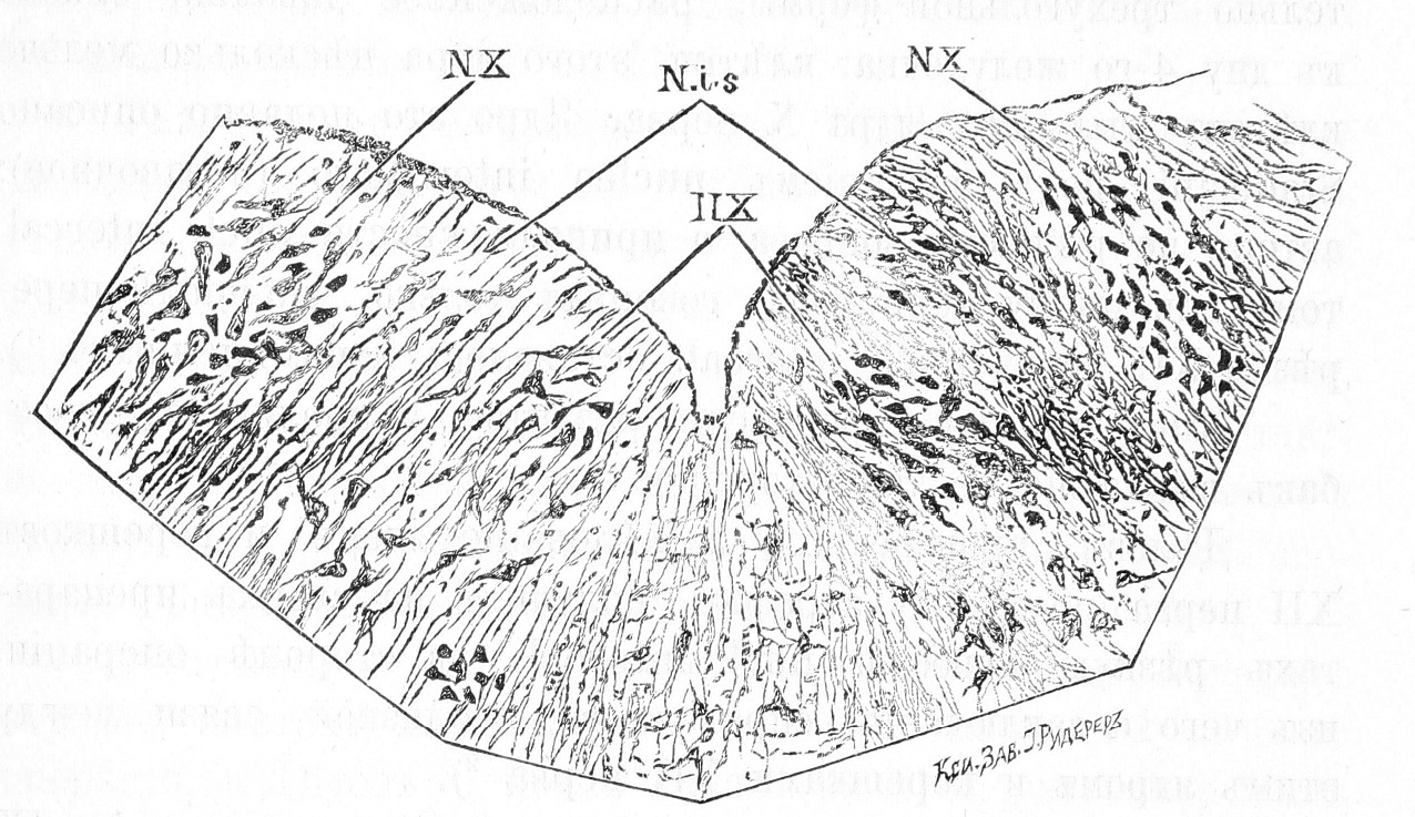 Телятникъ [17]) послѣ перерѣзки IX нерва также находилъ атрофію клѣтокъ классическаго ядра XII нерва на сторонѣ операціи, а Дѣловъ [18]), послѣ перерѣзки XII нерва, обнаружилъ ясныя атрофическія измѣненія въ тыльномъ ядрѣ X нерва также на сторонѣ операціи.