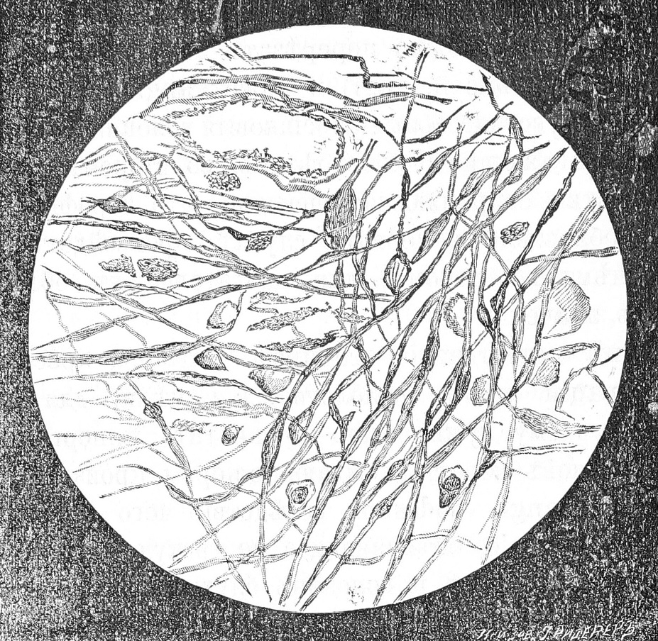 Четкообразныя утолщенія волоконъ зависятъ отъ неравномѣрнаго расположенія міэлина вокругъ осевого цилиндра, что доказывается синеватою окраской этихъ утолщеній гематоксилиномъ по сп. Паля. Описанныя волокна расположены въ области тыльныхъ ядеръ X нерва и отчасти ядеръ ХП-го. Рис. II и взятъ изъ областей ядеръ X и XII нервовъ. Большая часть измѣненныхъ волоконъ, находящихся въ этой стадіи атрофическаго процесса, относится къ концевымъ волокнамъ корешковъ блуждающаго нерва.