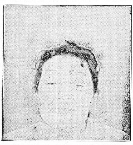 Изъ другихъ явленій слѣдуетъ отмѣтить общую нѣсколько повышенную чувствительность на всей поверхности тѣла. Чувствительность въ области тройничнаго нерва не обнаруживаетъ никакихъ существенныхъ разстройствъ. Сухожильные и кожные рефлексы нѣсколько повышены, но равномѣрны. Со стороны внутреннихъ органовъ ничего ненормальнаго не наблюдается. Во время нѣсколькихъ посѣщеній больной было замѣчено между прочимъ, что временами больная смотритъ съ вполнѣ хорошо открытыми глазами (см. фиг. 1), но достаточно обратить вниманіе больной на это явленіе, какъ спустя уже нѣсколько минутъ ея вѣки снова опускаются и тогда уже никакими усиліями воли больной не удается ихъ поднять хотя бы незначительно болѣе противъ того, какъ они обыкновенно представляются въ опущенномъ состояніи (см. фиг. 2).